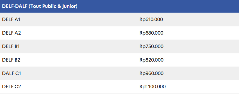 Pendaftaran Ujian DELF-DALF Periode Juli 2023 Telah dimulai mulai dari tanggal 02 – 14 Mei 2023. Pendaftaran dilaksanakan secara Online melalui link https://linktr.ee/DaftarDELF. Biaya Ujian DELF-DALF Periode Juli 2023 sebagai berikut: