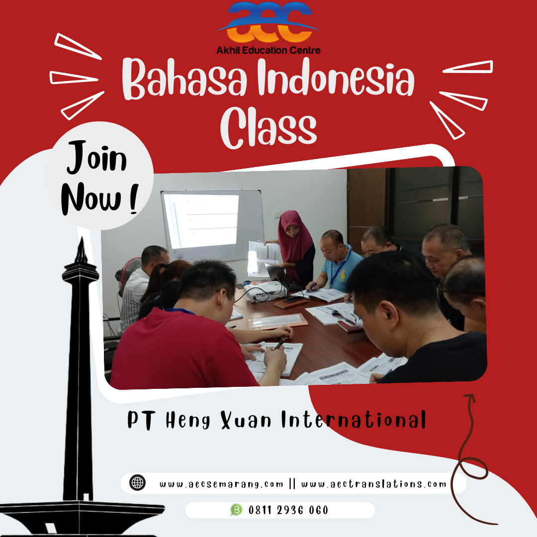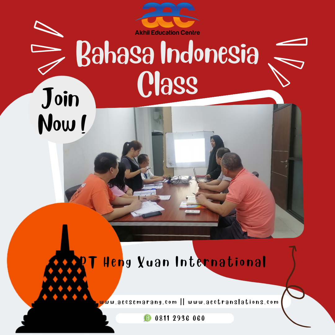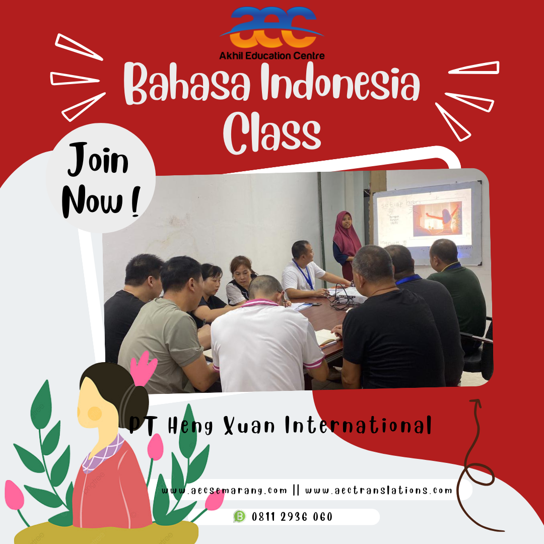Dan seperti bulan September tahun 2023 ini, AEC Semarang berkolaborasi dengan PT Heng Xuan International, Rembang untuk memberikan pelatihan Kursus Bahasa Indonesia bagi staff dan pekerja yang berasal dari China.