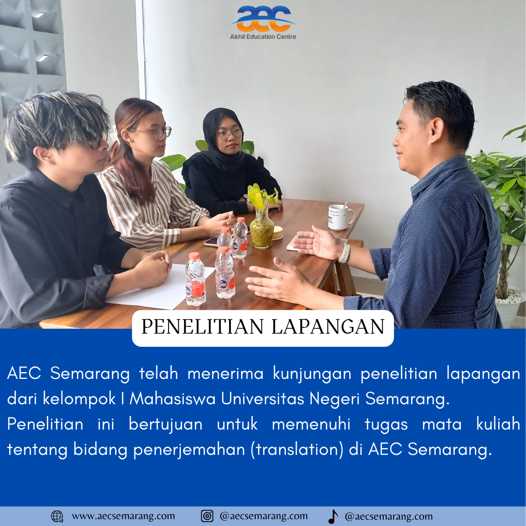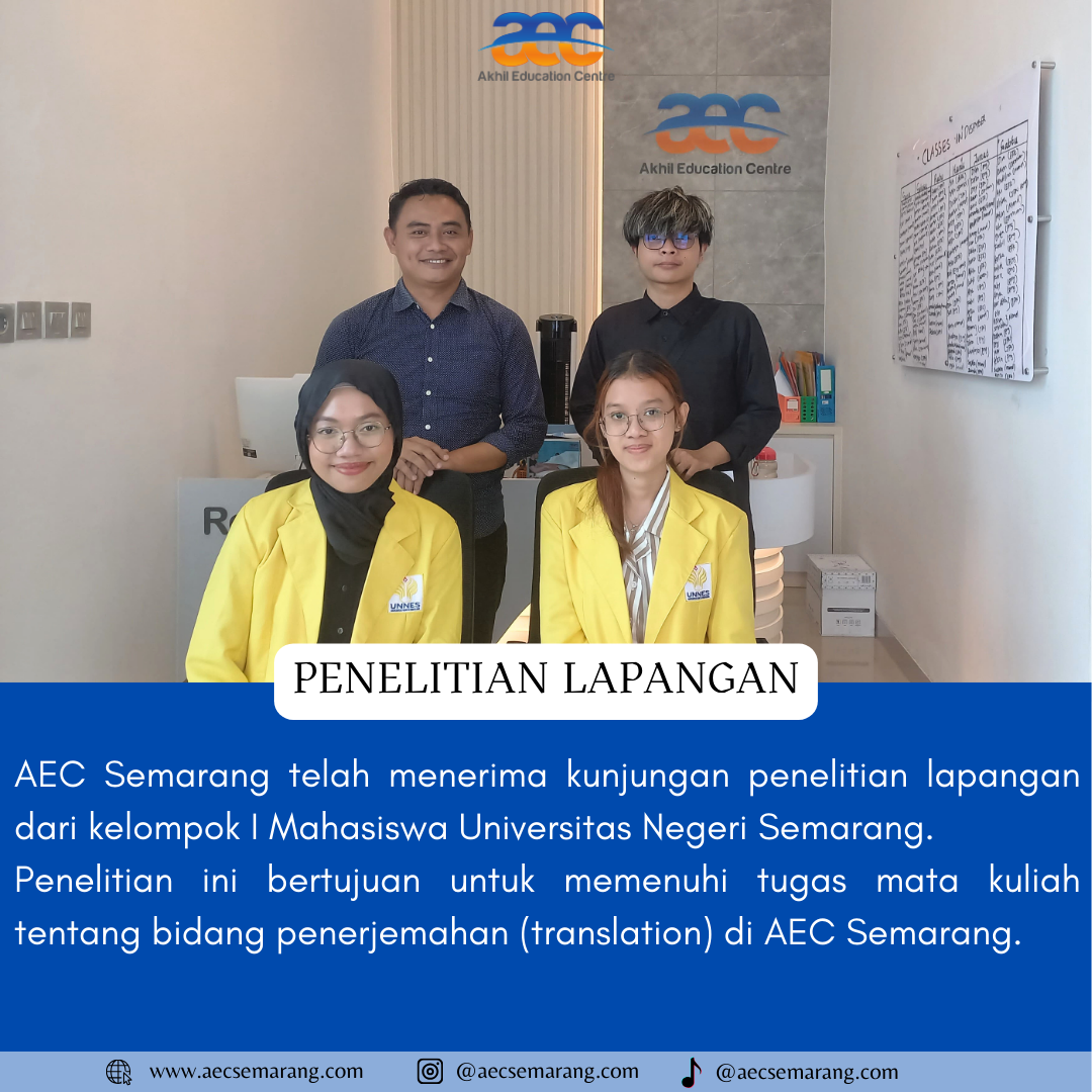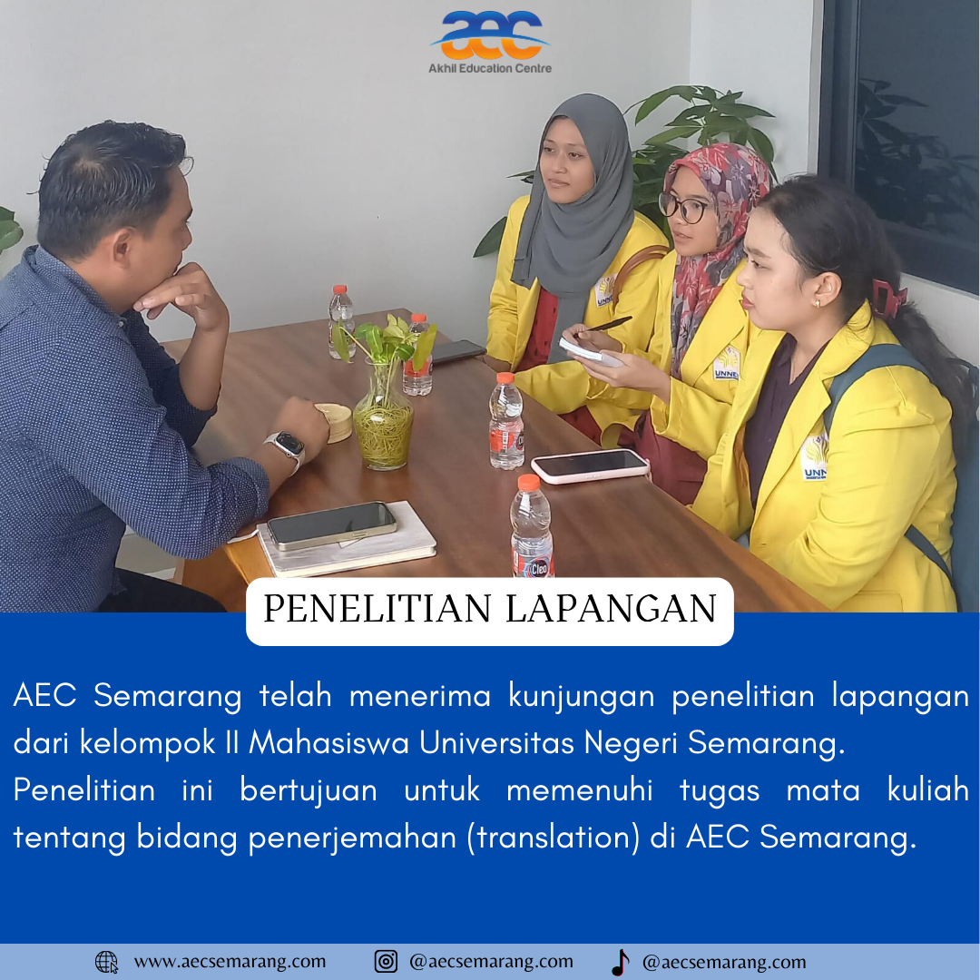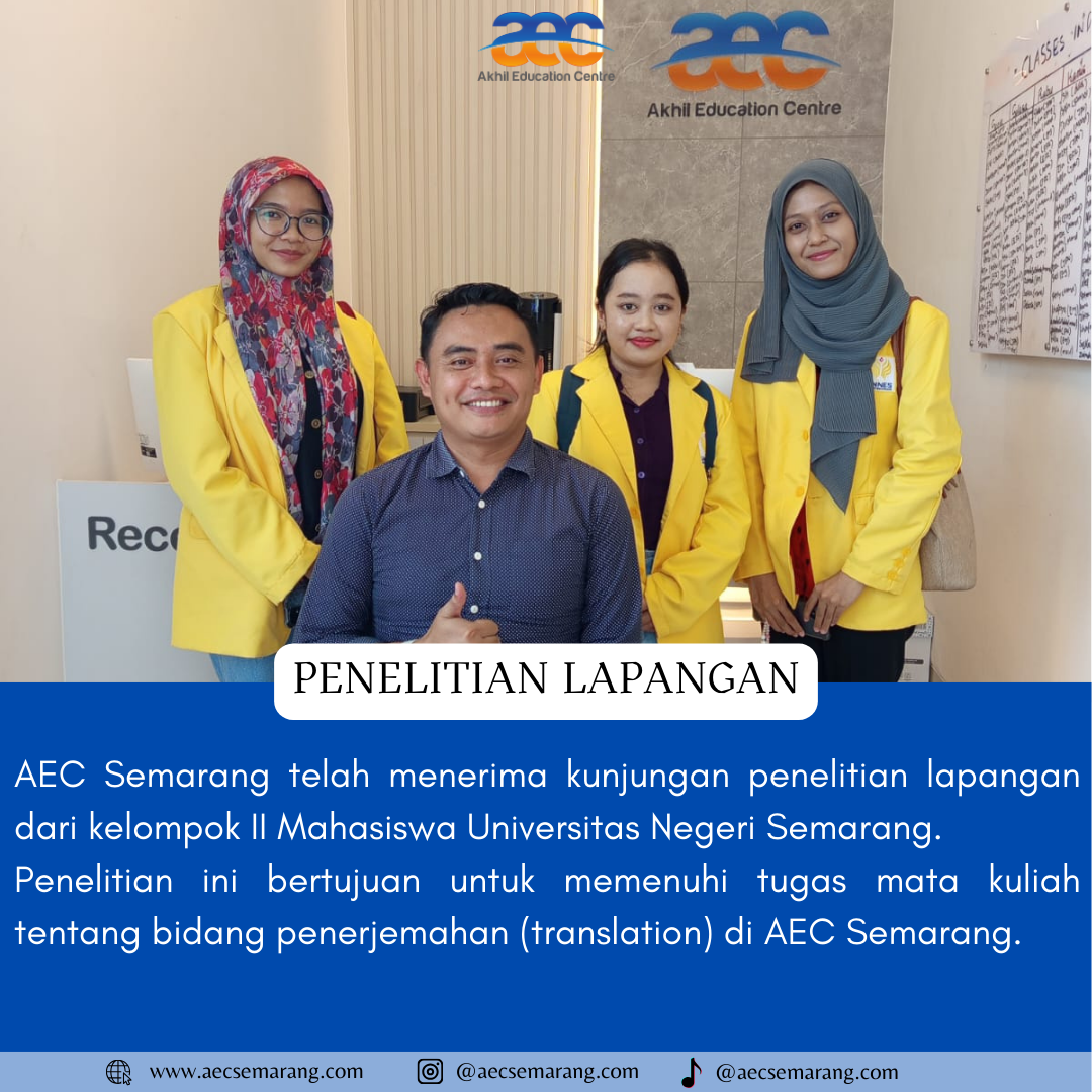 Penelitian lapangan adalah salah satu hal yang tidak asing di dengar oleh kalangan para mahasiswa. Kegiatan ini dilakukan biasanya karena memang ada suatu hal yang ingin di ketahui lebih dalam mengenai hal tersbut sehingga di perlukan penelitian yang lebih dalam. Seperti yang di ketahui bahwa AEC Semarang memang bukan hanya memiliki dan melayani kursus Bahasa Asing saja. Akan tetapi juga ada beberapa program lainya yang disediakan di AEC Semarang.