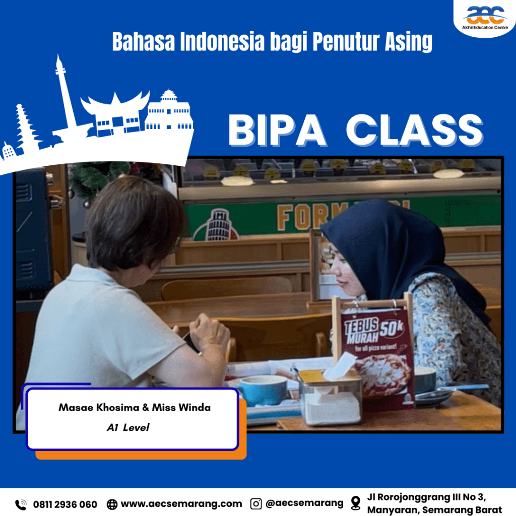 Bahasa Indonesia bagi Penutur Asing atau dikenal dengan istilah BIPA sudah tidak asing lagi di dengar. Bahasa Indonesia saat ini banyak dipelajari oleh warga asing dengan maksud dan tujuan yang berbeda beda. Dibulan ini AEC Semarang memiliki salah satu siswa berasal dari negara Sakura atau kita semua biasa menyebutnya negara Jepang. Siswa ini saat ini sedang menjalani sebuah program bersama Japan Foundation menjadi sebagai asisten mengajar disalah satu sekolah di Semarang. Mempelajari Bahasa Indonesia baginya saat ini sangatlah penting. Dikarenakan program yg dijalani saat ini tidaklah singkat dan cukup lama untuk tinggal di Indonesia khususnya di Kota Semarang. Ibu Masae, begitulan nama panggilan beliau sebagi siswa kami disini. Saat ini beliau mengambil dari level dasar atau pemula yaitu A1. Pembelajaran dilaksanakan 2x dalam seminggu di salah satu cafe yang lokasinya tidak jauh dengan tempat tinggal siswa. Kelas pada level A1 ini diajarkan oleh Miss Winda Rahmawati selaku pengajar BIPA di AEC Semarang.