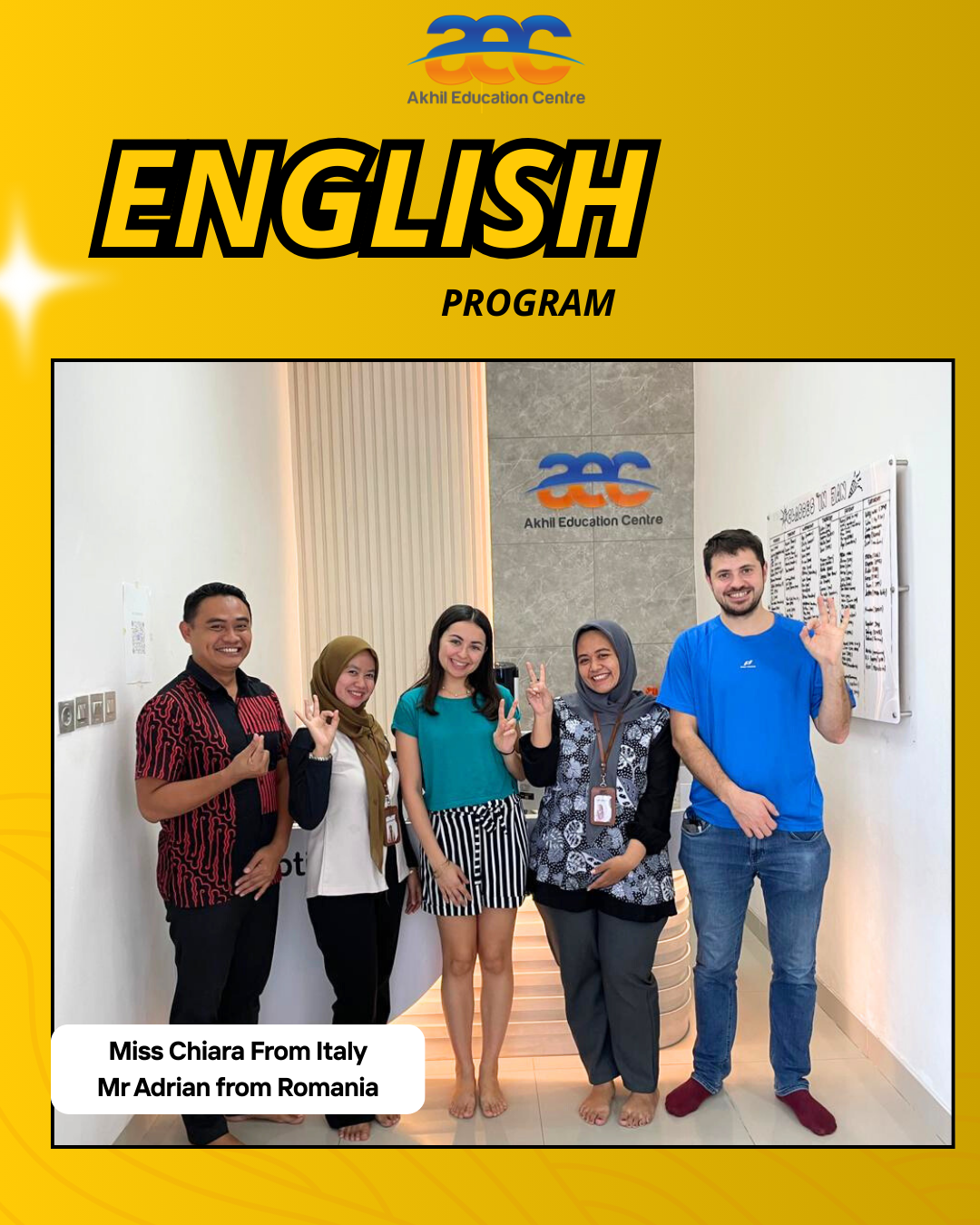 Selain mengajar dan menjalankan program di sekolah masing masing, Miss Chiara dan Mr Adrian juga akan mengajar sebagai asisten pengajar Bahasa Inggris di AEC Semarang setiap hari sabtu. Jadi bagi temen teman dan siswa -siswa AEC jangan khawatir ya. Kalian juga akan memiliki pengalaman untuk belajar Bahasa Inggris bersama Native di AEC Semarang. AEC Semarang akan menjadwalkan setiap harinya untuk kelas yang akan diajar oleh para native setiap hari sabtunya.