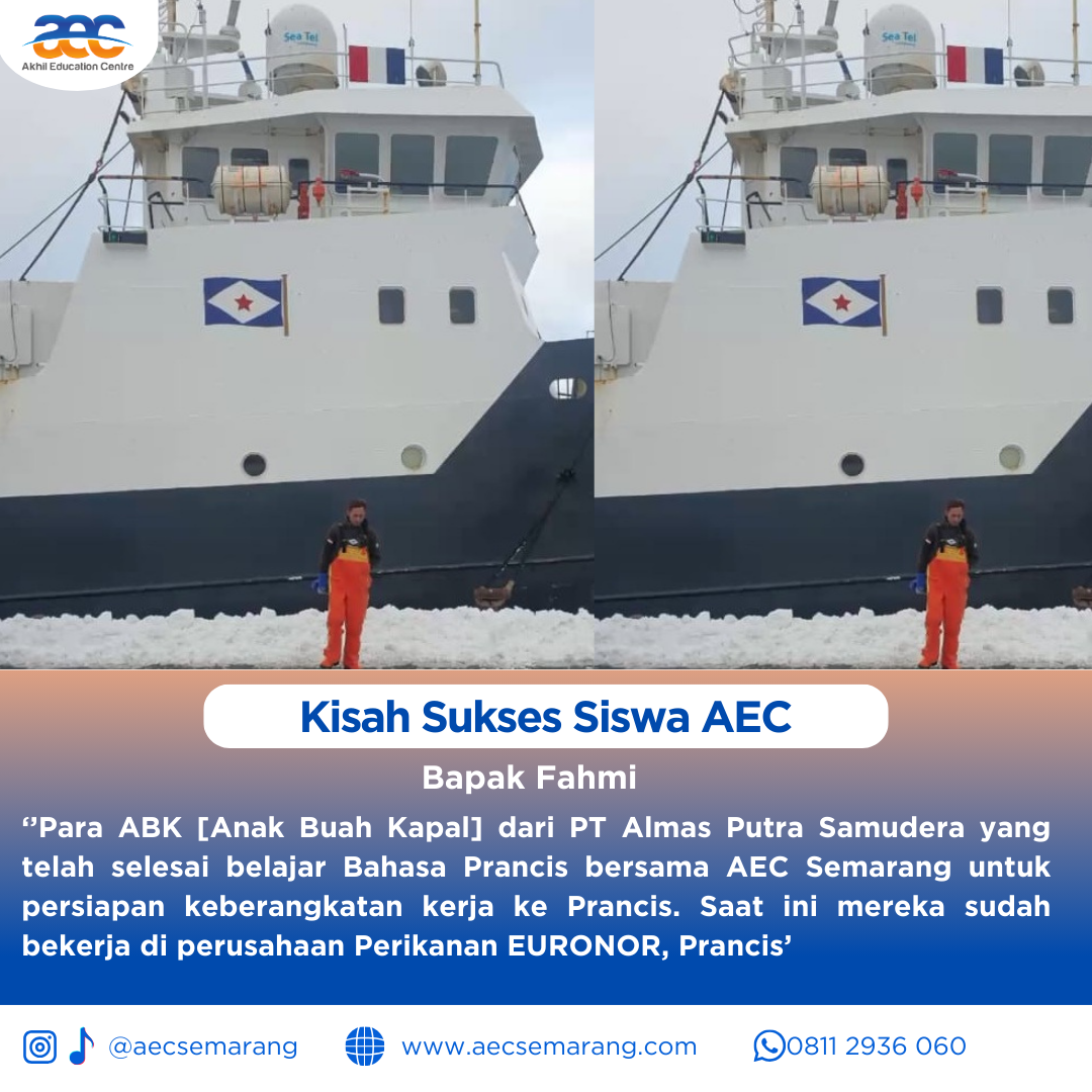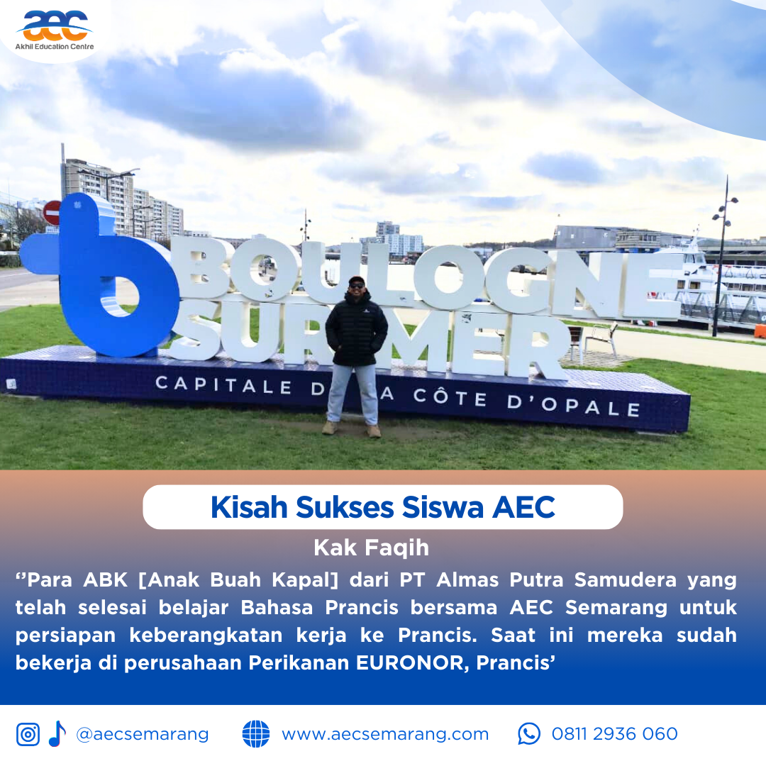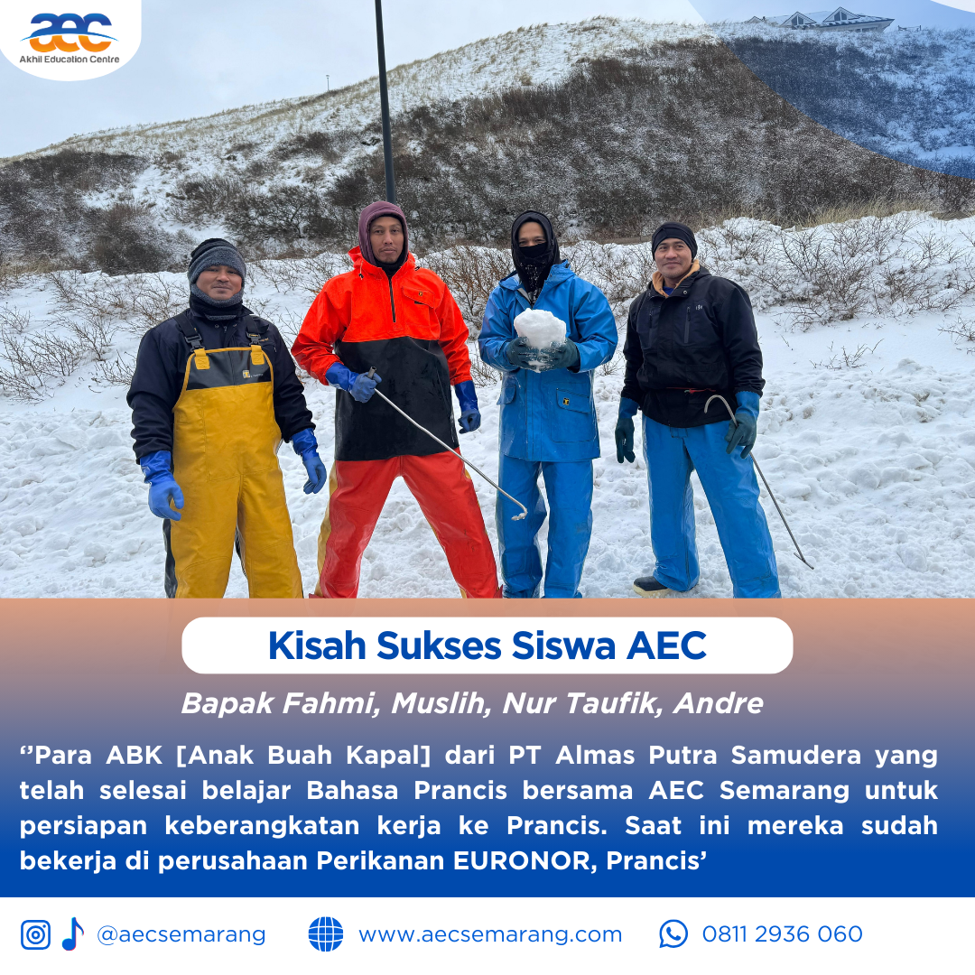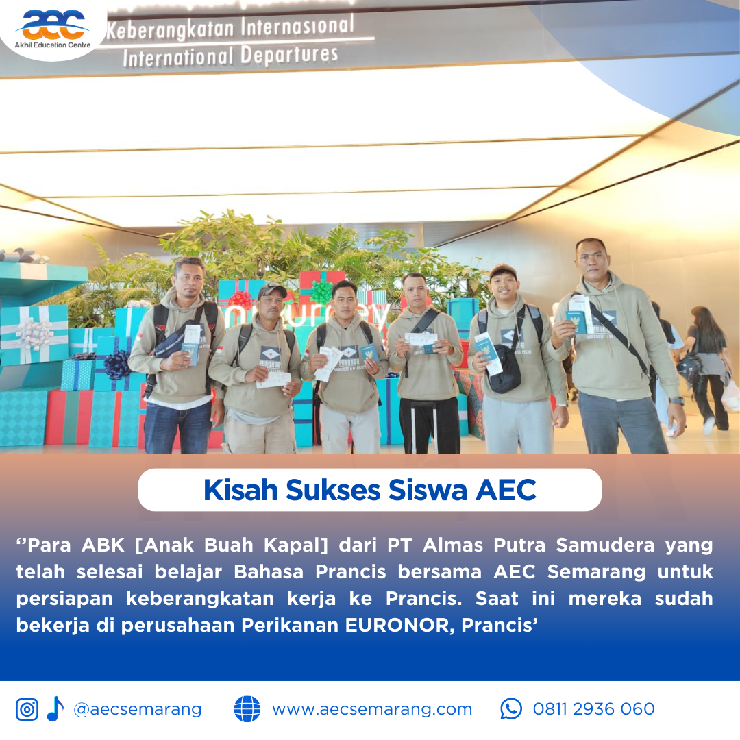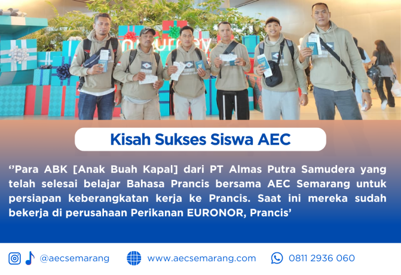 Belajar memang tidak mengenal usia dan latar belakang seseorang. Dimana ada niat dan tekat yang kuat setiap orang bisa mengenal bahkan mempelajari hal-hal baru. Beratnya tantangan saat belajar akan terbayarkan lunas saat kita mendapatkan hasil kerja keras dari usaha kita untuk belajar. Terkadang kita dipaksa harus belajar karena keadaan, namun juga terkadang karena kemauan diri sendiri. Kisah sukses para siswa siswa AEC yang dibulan Januari 2026 kemarin saat ini telah berbuah manis. Para ABK [Anak Buah Kapal] dari PT Almaz Putra Samudra yang telah slesai belajar Bahasa perancis A1 bersama AEC Semarang kini sudah terbang dan bekerja di negara negara Eropa. Para ABK telah menyiapkan bekal untuk belajar Bahasa Perancis sebelum pada akhirnya mereka bekerja dan bertemu secara lgsg di negara Eropa.