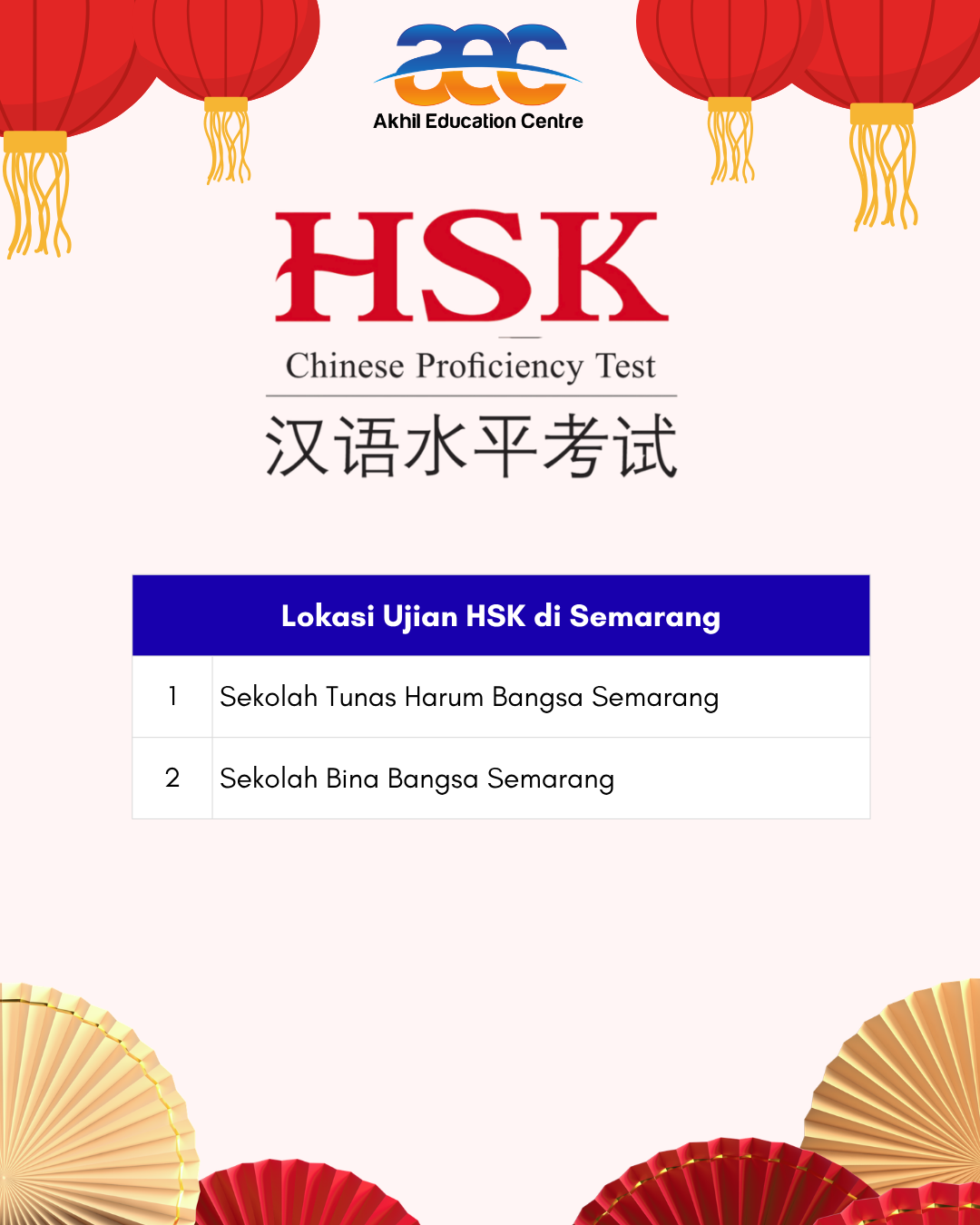 Akan tetapi, tidak banyak orang yang sudah mengetahui dan masih bingung apabila ingin melakukan Test atau Ujian HSK khususnys di wilayah Semarang. Lembaga lain atau bahkan AEC saat ini belum bisa mengadakan ujian HSK. Hal tersebut dikarenakan ujian HSK hanya dapat dilakukan oleh Badan atau Lembaga Koordinasi Pendidikan Bahasa Tionghoa. Oleh karena itu, saat ini AEC belum dapat melaksanakan Ujian HSK secara mandari.