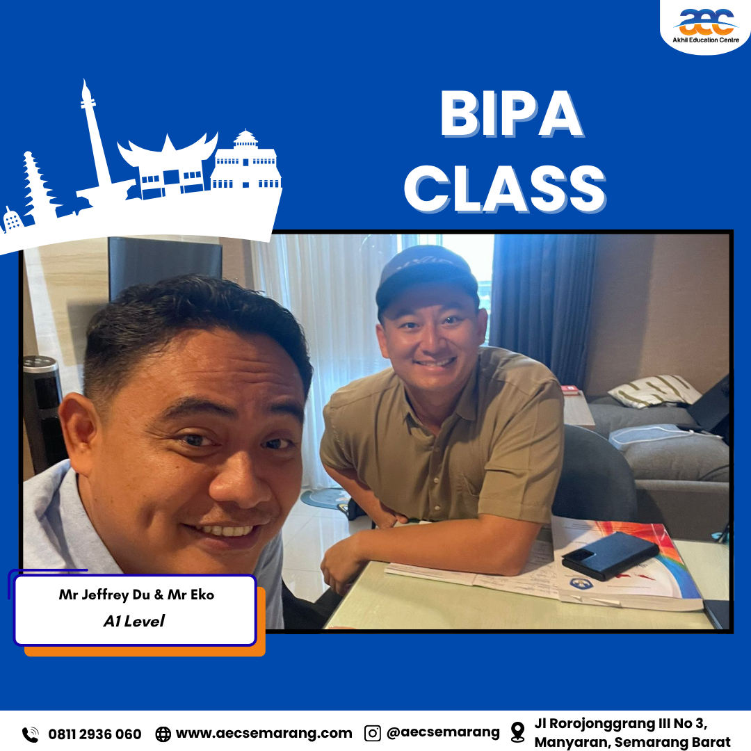 Kelas pembelajaran BIPA dilaksanakan secara private Home. Yang mana pembelajaran hanya terdiri dari satu pengajar dan satu siswa. Kelas dilaksanakan di tempat tinggal siswa setiap 1x seminggu. Karena dengan jadwal Mr Jeff yang cukup padat makam beliau hanya bisa mengambil 1xd dalam seminggu. AEC Semarang dapat mengikuti sesuai request yang diminta oleh siswa atau klien dengan S&K yang berlaku.