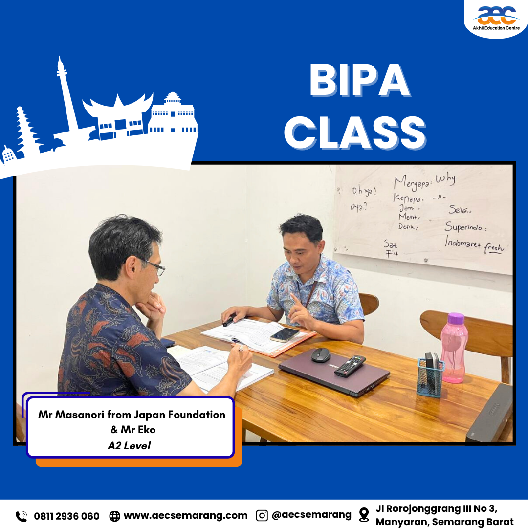 Tahukan kalian di AEC Semarang sudah lama menyediakan kelas BIPA? Istilah BIPA biasa juga dikenal dengan sebutan Bahasa Indonesia bagi Penutur Asing. Level dalam belajar BIPA tidak berbeda jauh dengan level Bahasa lainnya. Saat ini AEC Semarang memiliki salah satu siswa pembelajar Bahasa Jepang yang berasal dari negara Jepang. Beliau saat ini sedang memiliki program di Indonesia sebagai asisten mengajar Bahasa Jepang di salah satu sekolah Semarang. Mr Manasori yang berasal dari Negara Jepang tepatnya dari Japan Foundation saat ini mengambil pembelajaran BIPA A2 di Semarang. Karena beliau sudah pernah belajar Bahasa Indonesia sebelumnya selama satu tahun, beliau sudah memiliki basic Bahasa Indonesia dan dapat mengambil level A2 sekaligus di AEC Semarang.