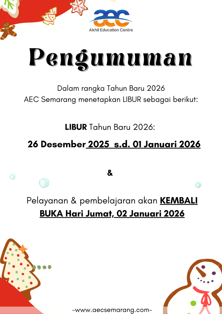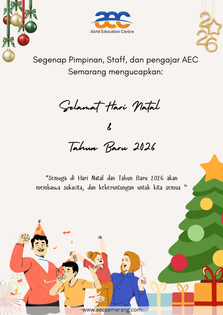 Semoga apapun resolusi dari teman teman semua di tahun baru yang akan datang, minAEC berharap semuanya dapat terkabulkan ya. Oh ya dalam menyambut Hari Natal dan Tahun Baru: Segenap Pimpinan, Staff dan Pengajar AEC Semarang mengucapkan Selamat Hari Natal dan Tahun Baru 2026. Semoga di Hari Natal dan Tahun Baru membawa sukacita dan keberuntungan bagi kita semua.