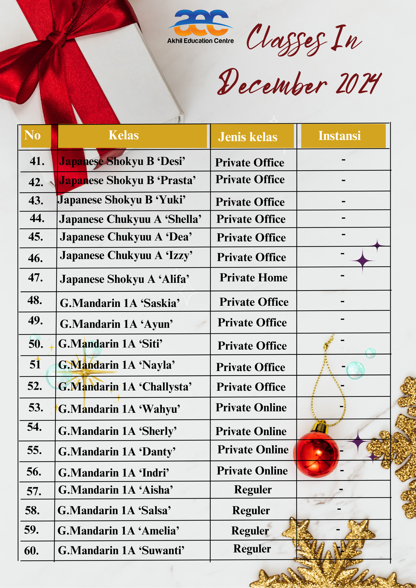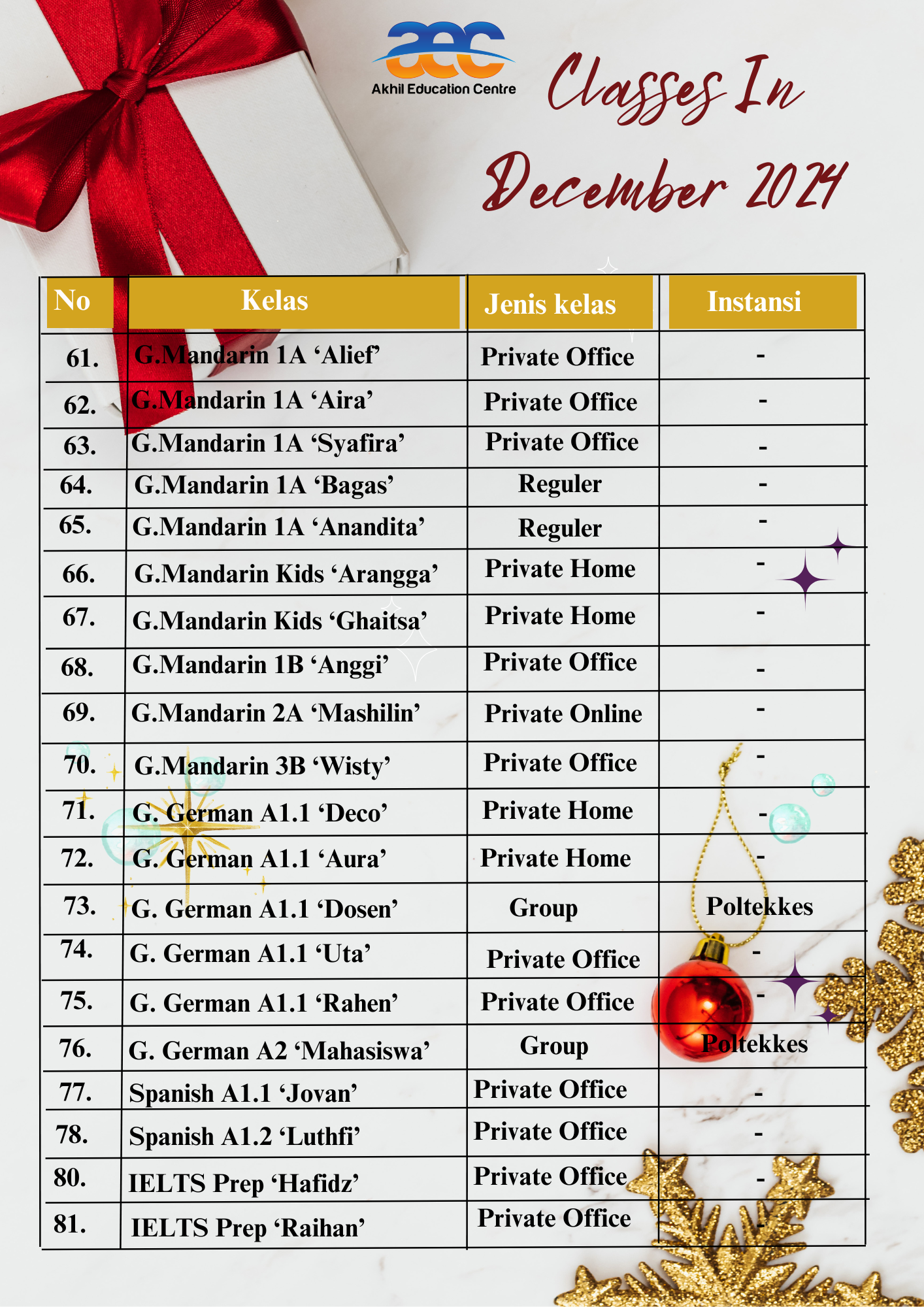 Oh ya, tidak lupa nih minAEC mau share untuk list kelas dibulan maret 2025. Apakah sudah ada nama kalian di list bulan maret ini? Bagi yang belum ada, yuk segara bergabung belajar Bahasa Asing di AEC. Fyi, bulan maret ini AEC sedang ada promo Ramadan Fiesta lho. Promo ini berlaku selama bulan Ramadan untuk periode pendaftaran tanggal 01 – 19 Maret 2025 lho. Dan promo ini berlaku untuk semua pilihan Bahasa Asing di AEC Semarang. So, apapun pilihan Bahasa Asing kalian jangan kuatir ya, karena kalian bisa mendapatkan promo Ramadan Fiesta ini tanpa di undi.