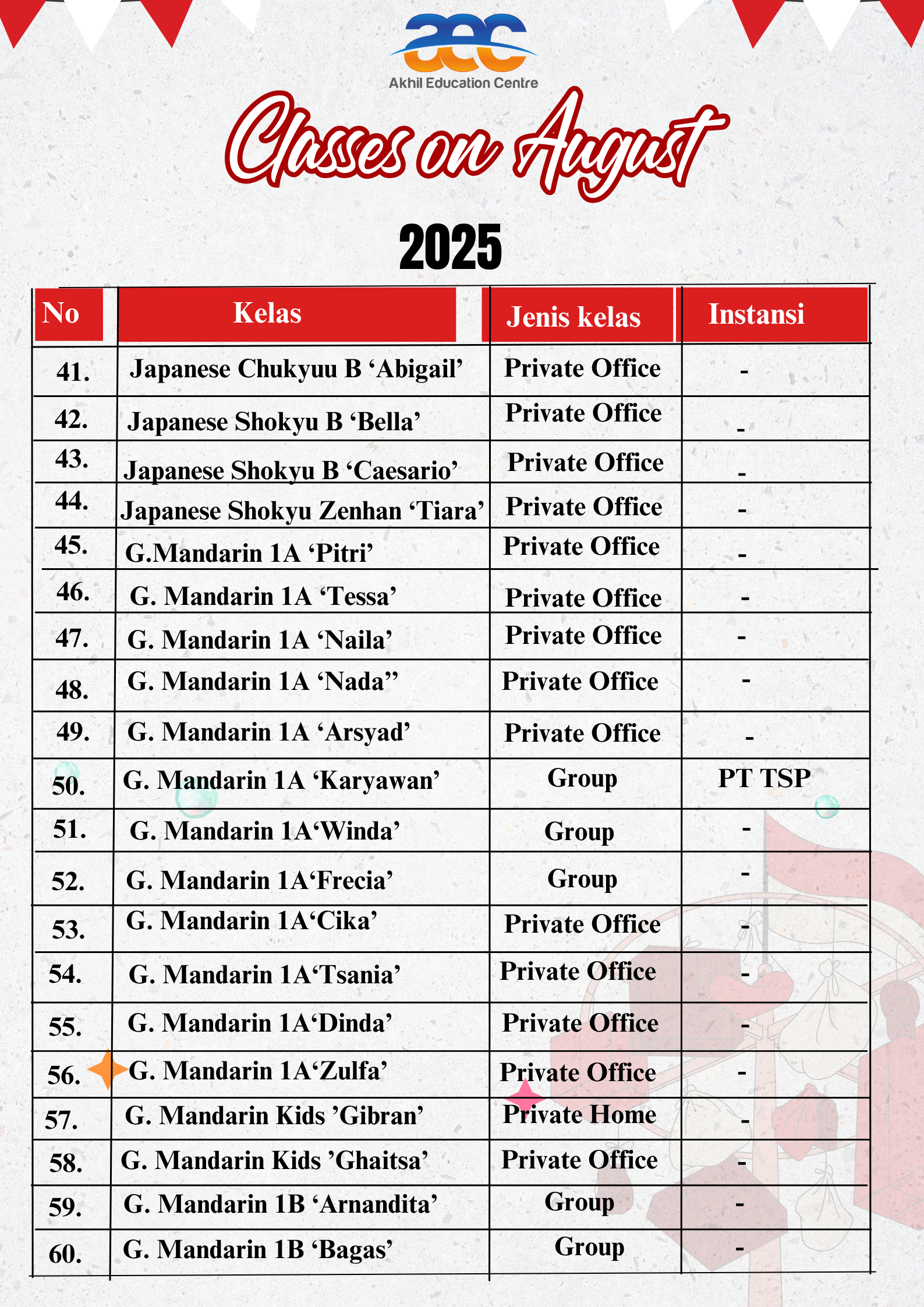 Kalian juga tidak usah khawatir ya, biaya kursus di AEC dapat dibayarkan sebanyak 2x bayar. Dengan syarat dan ketentuan yang dibuat oleh AEC Semarang. Jadi kalian tidak usah khwatir ya diminta untuk langsung melunasi semua total biaya di awanl sebelum kursus dimulai. Promo tentunya juga berlaku untuk segala usia,karena untuk belajar Bahasa Asing tidak mengenal usia. Berbagai usia siswa di AEC Semarang beragam, dimulai dari usia anak anak, usia dewasa, sampai dengan usia umum.