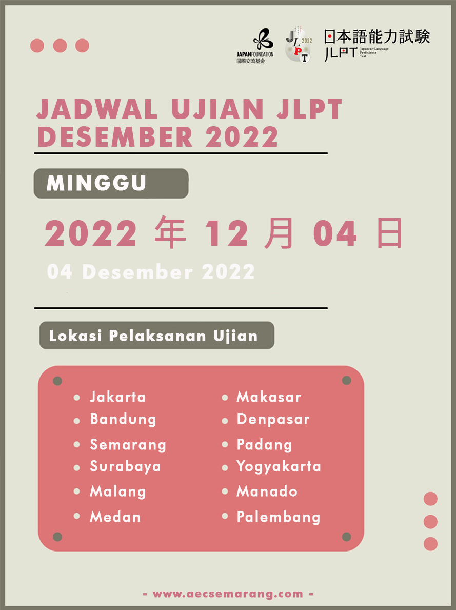 Masih bingung ? Ingin belajar lebih jauh lagi ? Yuk bergabung di kelas kursus Bahasa Jepang AEC Semarang. Prndaftaran Kelas Kursus Bahasa Jepang Periode Januari sudah dibuka lho…. Daftar yuk !!!