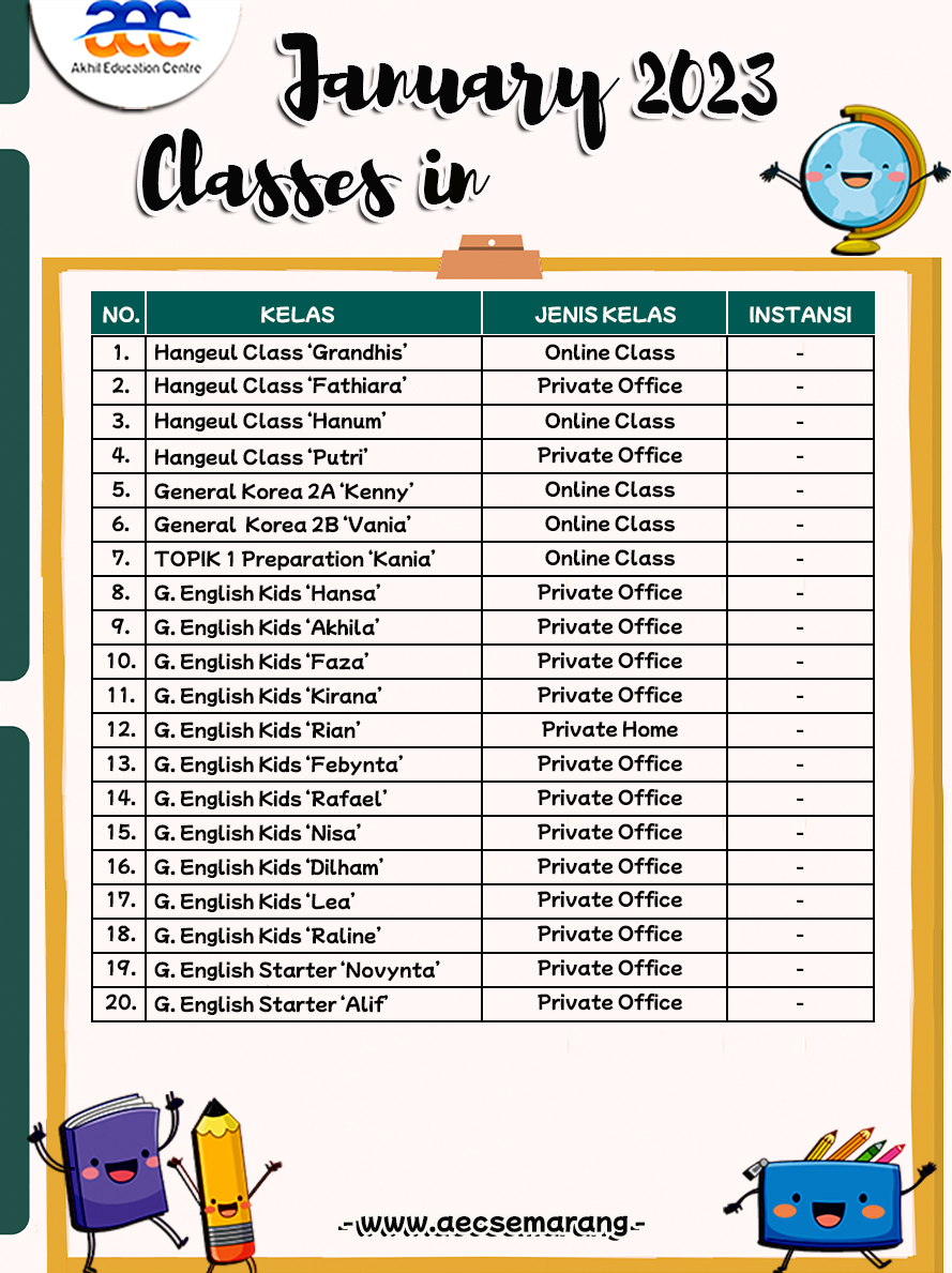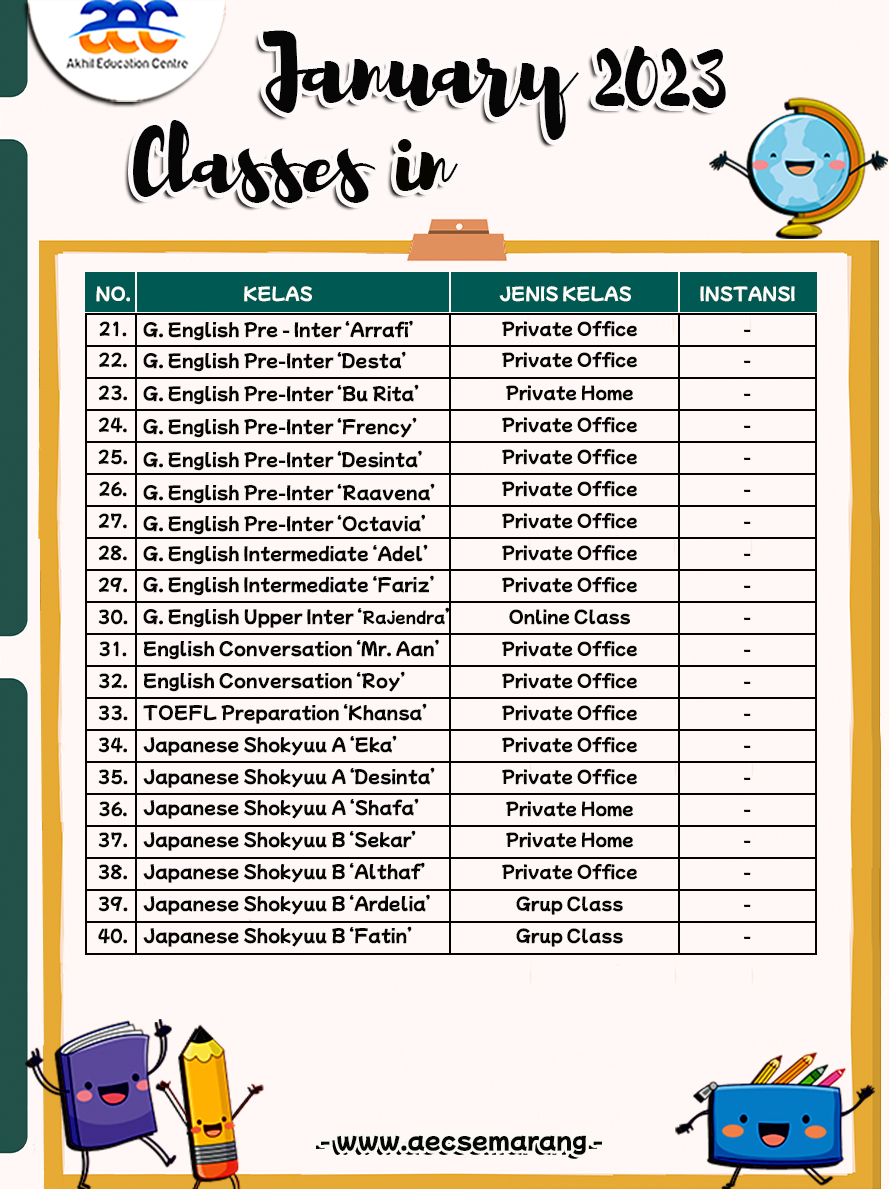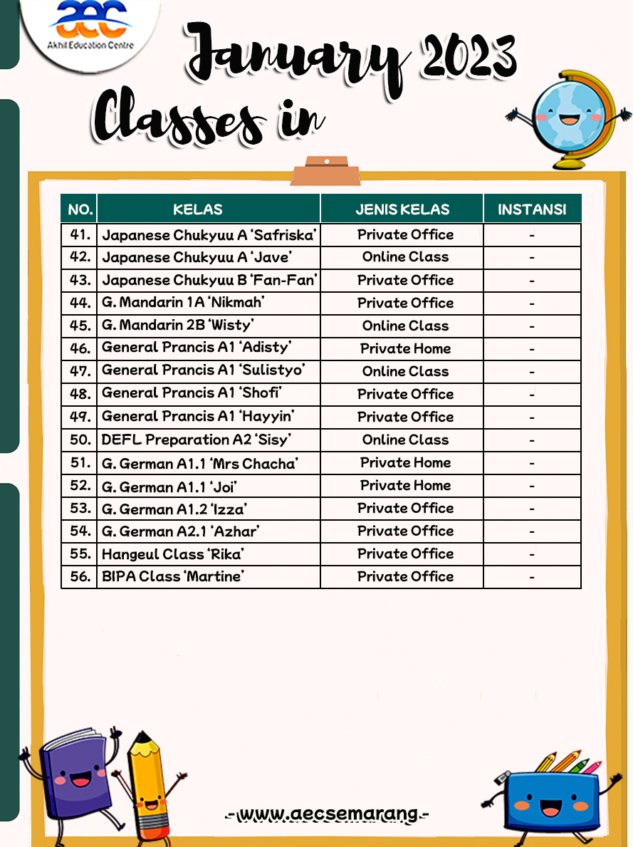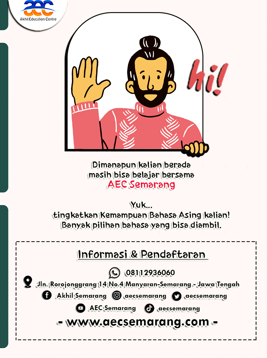 Jadi, di AEC Semarang ada kursus Bahasa Inggris, kursus Bahasa Korea, Kursus Bahasa Jepang, Kursus Bahasa Mandarin, Kursus Bahasa Perancis, Kursus Bahasa Jerman, dan Kursus Bahasa Spanyol.