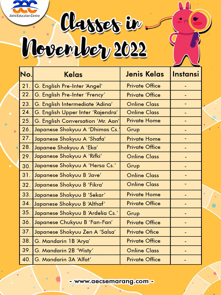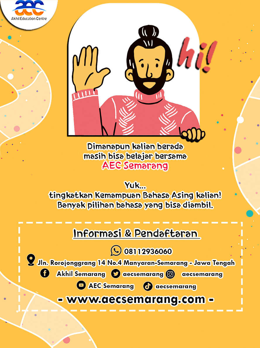 Semangat berjuang guys!!! Masih ada waktu 2 mingggu untuk memantapkan materi kalian. Bagi teman-teman yang ingi belajar intensive materi N5, N4, N3, N2, N1 untuk persiapan Ujian JLPT cuss merapat ke AEC Semarang ^o^