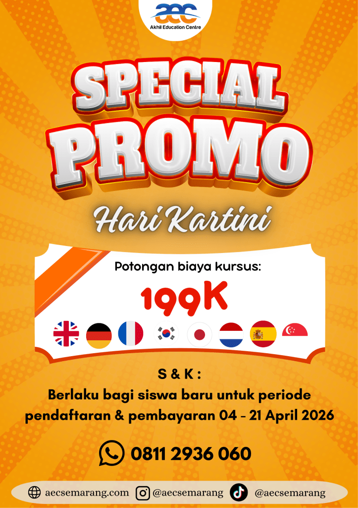 Oleh karena itu dalam rangka untuk memeriahkan Hari Kartini bagi teman teman AEC yang memiliki keinginan untuk mengasah skill Bahasa Asing bisa banget untuk mendapatkan promo yang saat ini sedang berlangsung.