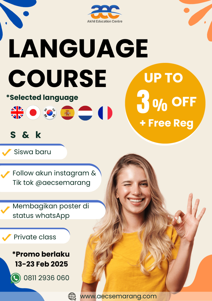 Promo kursus Bahasa Asing dibulan Februari kembali hadir untuk temen temen semua nih. Tidak usah kuatir kalau promonya sedikit ya, promo yg minAEC buat hmmm lumayan lho. Promo ini berlaku untuk beberapa Bahasa asing yang saat ini ada di AEC Semarang. Peminat Bahasa Asing semakin hari semakin meningkat promonya lho temen temen. Alasan meningkatnya peminat Bahasa Asing sesuai dengan kebutuhan mahasiswa masing masing siswa. Ada beberapa siswa yang berminat belajar Bahasa Asing karena memang ingin menambah kemampuan Bahasa Asing nya menjadi lebih banyak dan lebih baik lagi. Ada juga siswa yang mengambil kursus Bahasa Asing karena ingin memiliki tujuan sekolah atau bahkan bekerja di Luar Negeri. Selain itu ada juga alasan siswa untuk belajar Bahasa Asing adalah karena tuntutan bekerja dari perusahaan yang mengharuskan karyawannya untuk menguasai beberapa Bahasa Asing.