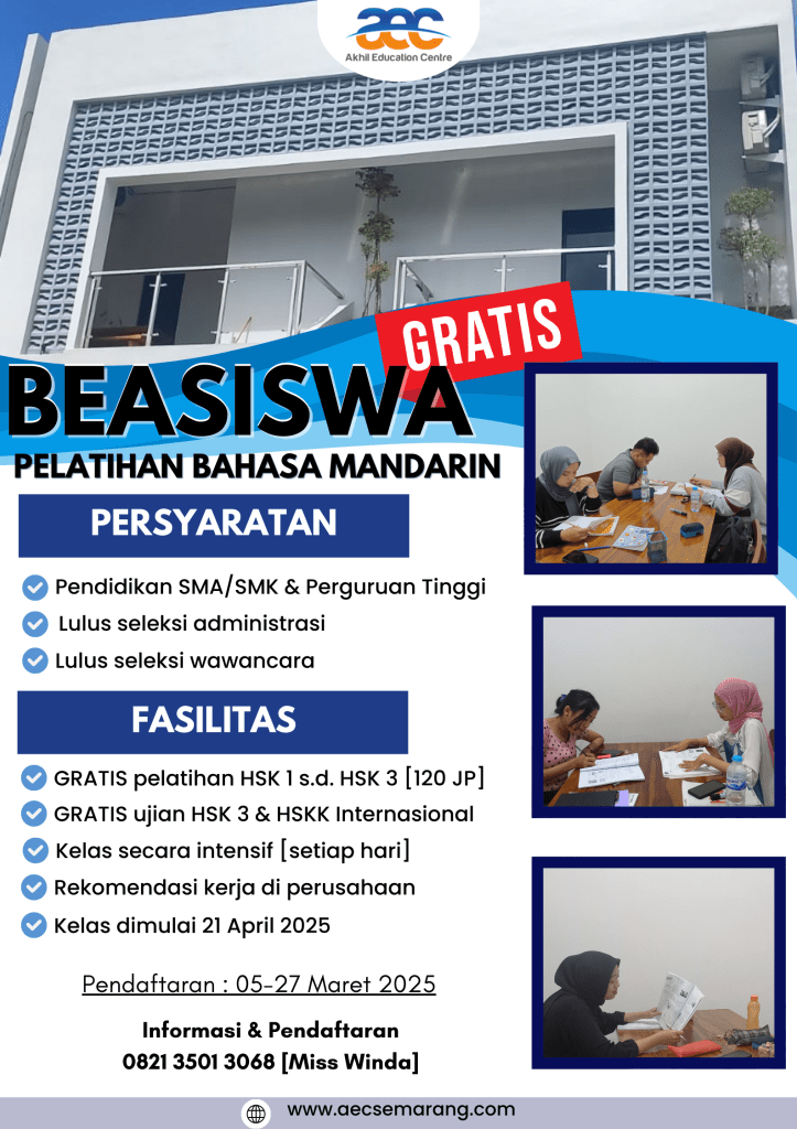 AEC Semarang saat ini membuka peluang beasiswa dalam pelatihan Bahasa Mandarin dari level dasar hingga level menengah secara GRATIS atau tidak dipungut biaya untuk pelatihan Bahasa Mandarin dalam program Beasiswa ini. Program beasiswa ini di adalah salah satu kesempatan yang sangat luar biasa apabila teman teman dapat lolos dalam semua tahapan seleksi.
