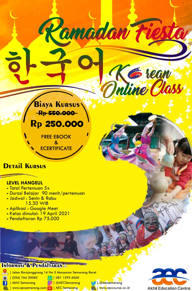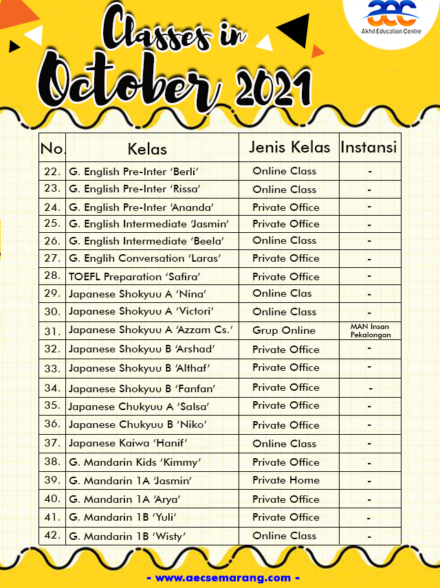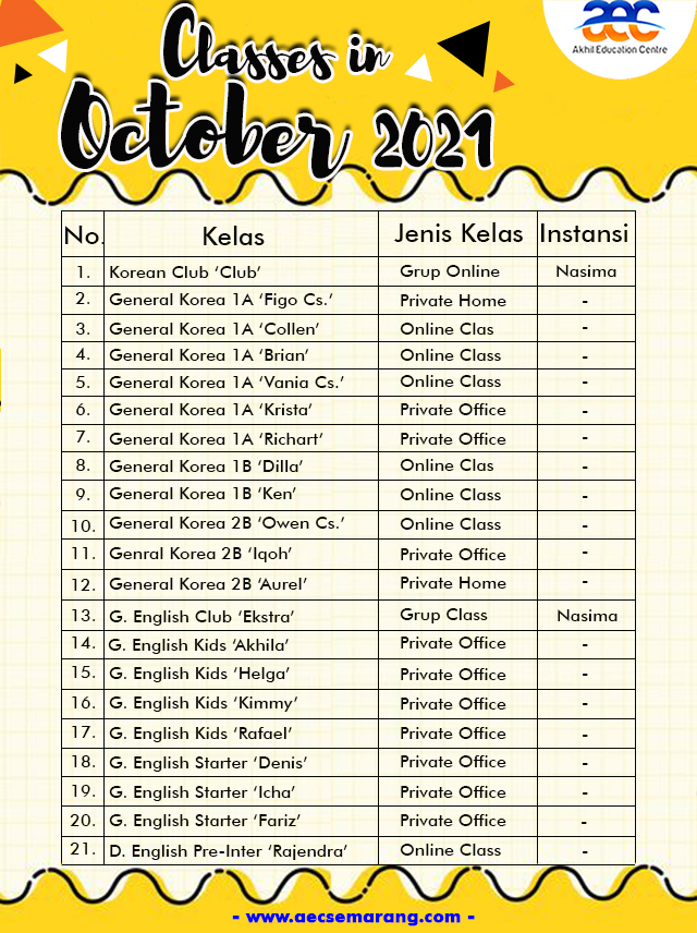 Wah kita sudah sampai di bulan Oktober guys. Saatnya kita share kelas-kelas apa saja yang ada di bulan Oktober 2021 ini. Bulan Oktober 2021 ini kelas-kelas di AEC Semarang masih tetap penuh. Banyak siswa yang bergabung di AEC Semarang untuk belajar Bahasa Asing.