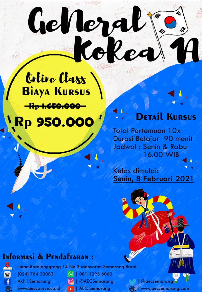 Akhil Education Centre (AEC) Semarang membuka pendaftaran Kelas Online Bahasa Korea Level 1A untuk periode bulan Februari 2021 ini. Kalian yang ingin belajar Bahasa Korea agar bisa membuat kalimat panjang atau bisa bercakap-cakap dengan bahasa korea??? Langsung aja bergaung di kelas Online Bahasa Korea Level 1A ini.
