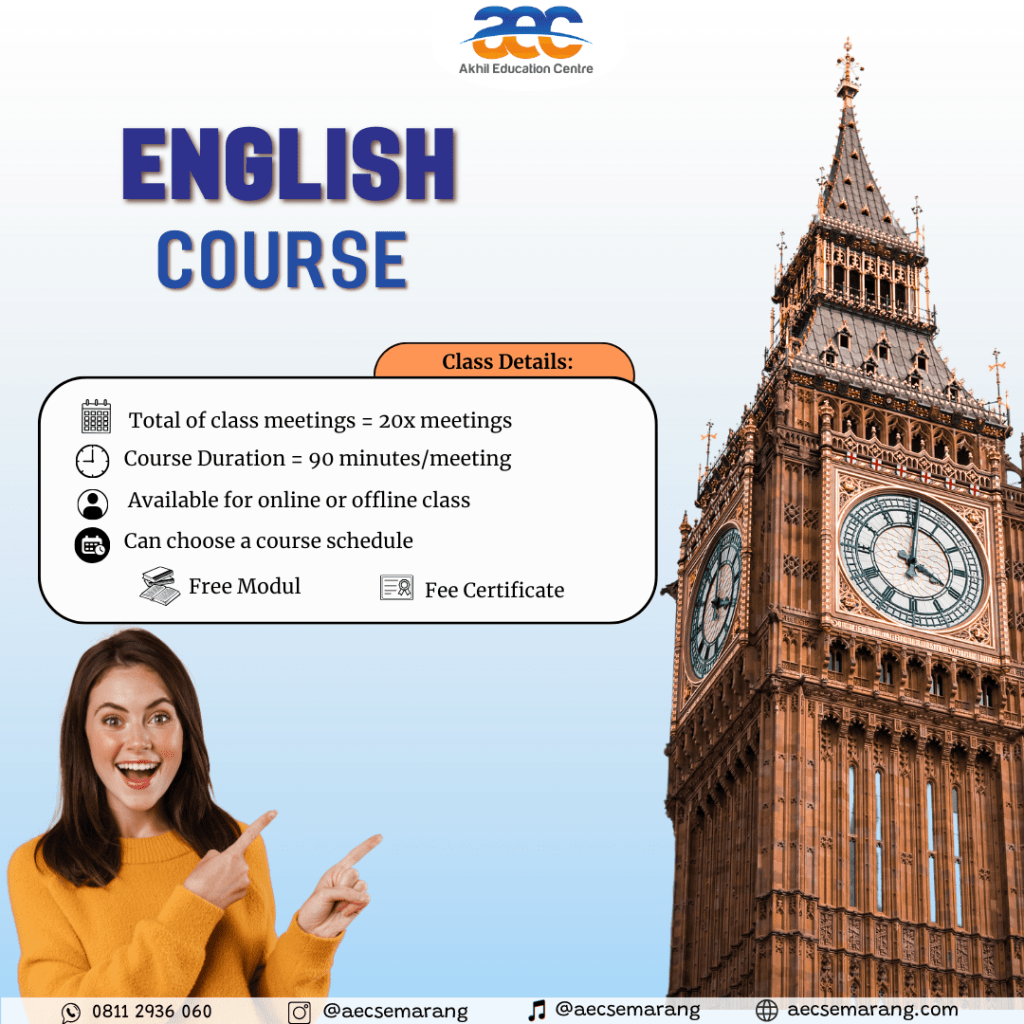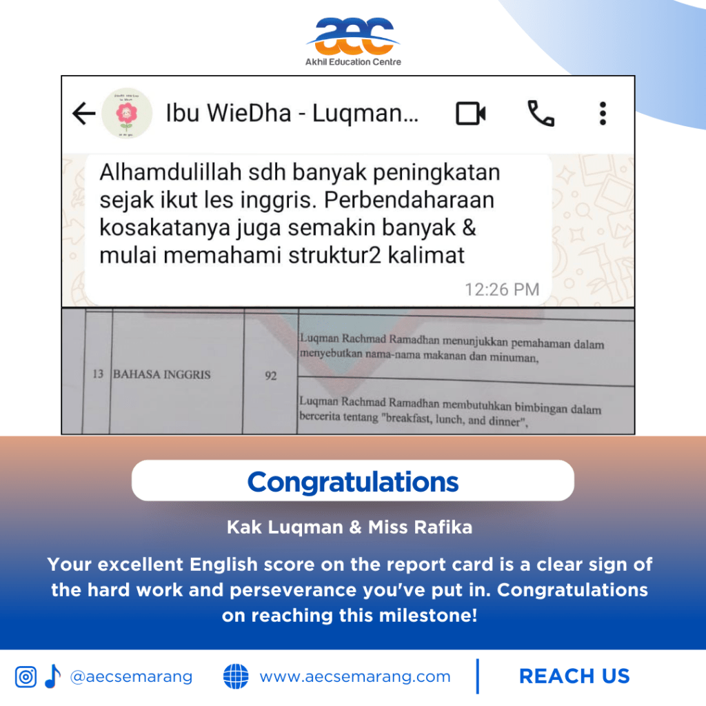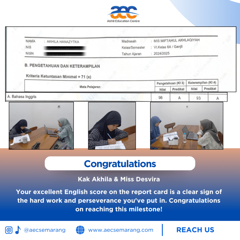Tetapi teman teman juga harus tau bahwa, mereka dapat mencapai nilai rapot diatas 90 juga karena atas kerja keras dan usaha mereka selama belajar. Baik itu belajar disekolah maupun di AEC Semarang saat mengukuti jam kursus Bahasa Inggris. Pembelajaran Bahasa Inggris di AEC Semarang hanya tersedia kelas private yang mana terdiri satu siswa dan satu guru. Metode ini banyak diminati oleh siswa dan orang tua siswa dalam belajar Bahasa Inggris.