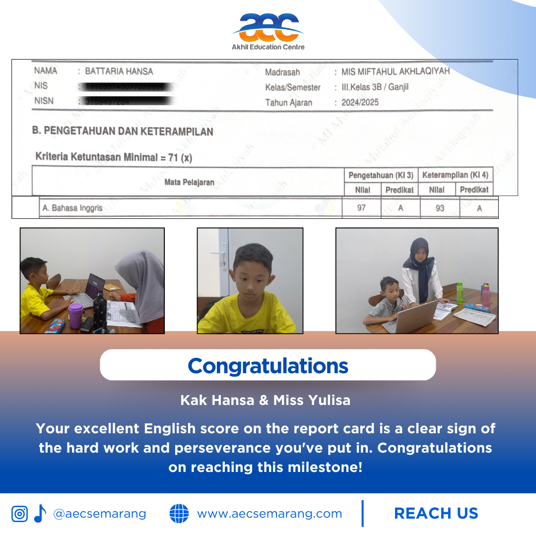 MinAEC ingin membagikan beberapa pencapaian nilai Bahasa Inggris siswa-siswi AEC Semarang dalam belajar Bahasa Inggris. Pencapaian dari pembelajaran Bahasa Inggris kali ini di peroleh dari nilai rapot siswa siswa kami di masing masing tempatnya bersekolah. Meskipun ketiga siswa ini masih tergolong siswa anak anak dan pada level usia Sekolah Dasar, akan tetapi pencapaian nilai Bahasa Inggrisnya disekolahan sudah mencapai nilai yang sangat memuaskan.