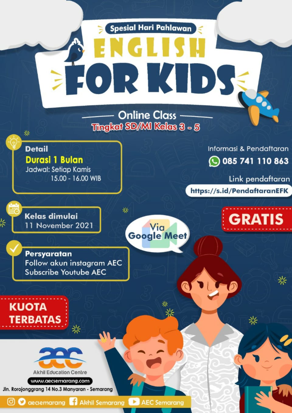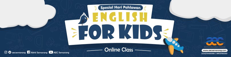 Saat ini Akhil Education Centre (AEC) Semarang membuka Kelas KURSUS BAHASA INGGRIS GRATIS dalam program English For Kids Spesial Hari Pahlawan. Kelas Kursus Bahasa Inggris GRATIS ini khusus untuk siswa SD/MI kelas 3 – 5 saja.