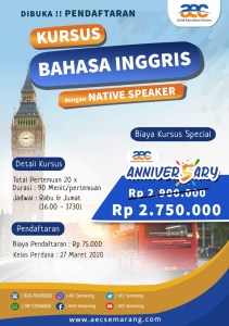 Kabar Gembira untuk kalian semua guys. Dalam rangka menyambut “Anniversary” yang ke-5, Akhil Education Centre [AEC] Semarang membuka Pendaftaran Kelas Promo. Kelas Promo bulan Maret 2020 yang dibuka yaitu Kelas Kursus Bahasa Inggris langsung bersama dengan Native Speaker.