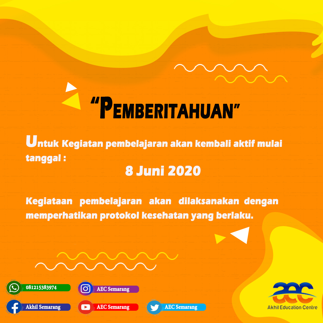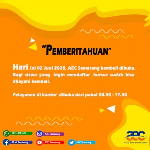 Mulai hari ini, 02 Juni 2020 AEC Semarang kembali dibuka untuk kalian semua dengan tetap mempertimbangkan protokol kesehatan ya tentunya.