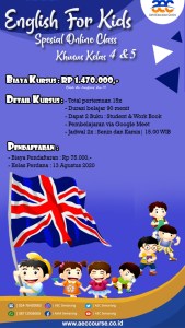 Kelas Bahasa Inggris untuk anak ini masuk di Level English for Kids. Kelas ini bisa diambil siswa dari jenjang SD kelas 1 hingga 6. AEC Semarang menghadirkan kelas yang menyenangkan untuk anak-anak. Materi pembelajaran lebih ditekankan di aspek speaking. Mengajak anak lebih berani berbicara bahasa Inggris tanpa rasa takut. Tentunya aspek yang lain seperti listening, reading dan writing juga di pelajari ya ayah buda.