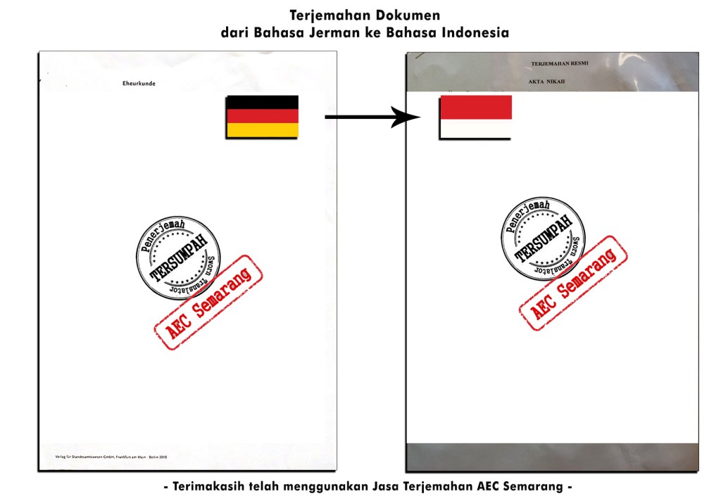 Salah satu dokumen yang baru saja selesai diterjemahkan di AEC Semarang adalah Surat Nikah dalam Bahasa Jerman. Dokumen berbahasa Jerman tersebut diterjemahkan ke Bahasa Indonesia secara tersumpah [SWORN]. Prosesnya cepat, hasilnya maksimal, biaya terjangkau.