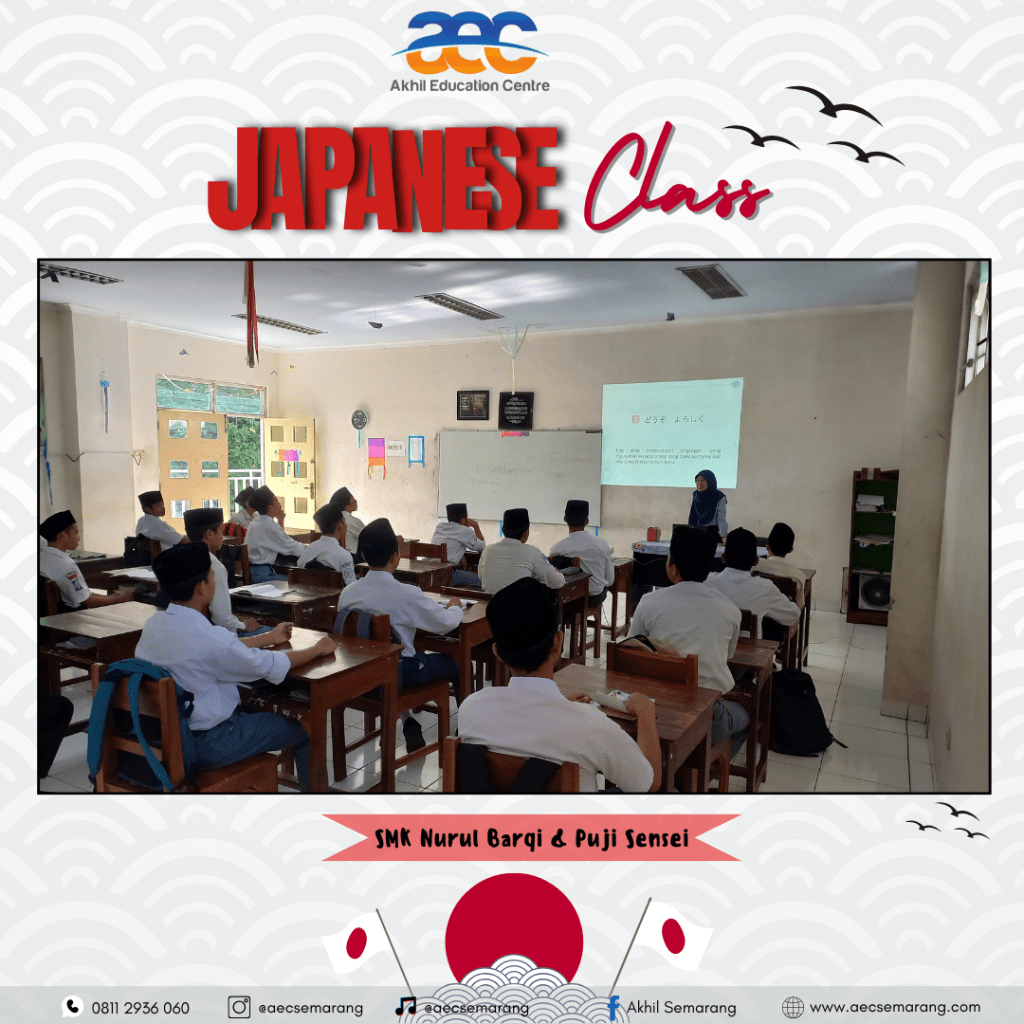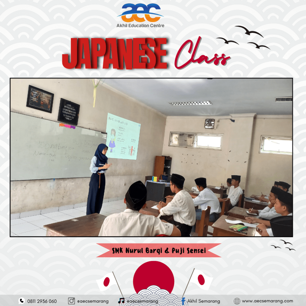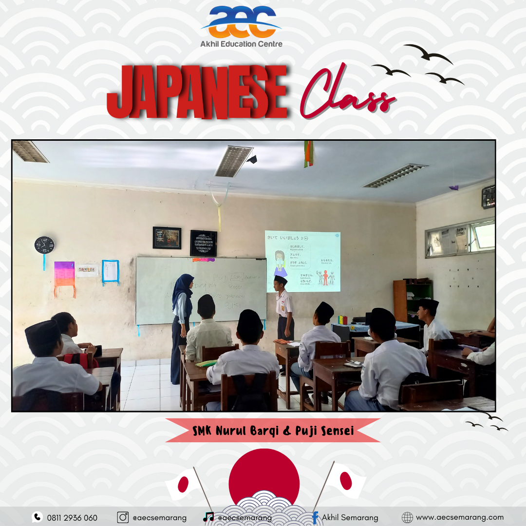 Kali ini AEC Semarang diajak untuk bekerjasama dengan salah satu sekolah menengah kejuruan atau SMK di kota semarang. Sekolah tersebut adalah SMK Nurul Barqi yang tepatnya berlokasi di daerah Gunung Pati, Semarang, Jawa Tengah. Kelas Bahas Jepang ini bertujuan untuk memberikan pengenaln dasar kepada siswa mengenai Bahasa Jepang seperti apa. Kelas ini di ikuti kurang lebih 25 siswa dari jurusan Teknik Mekatronika dan Teknik Ketenaglistrikan.