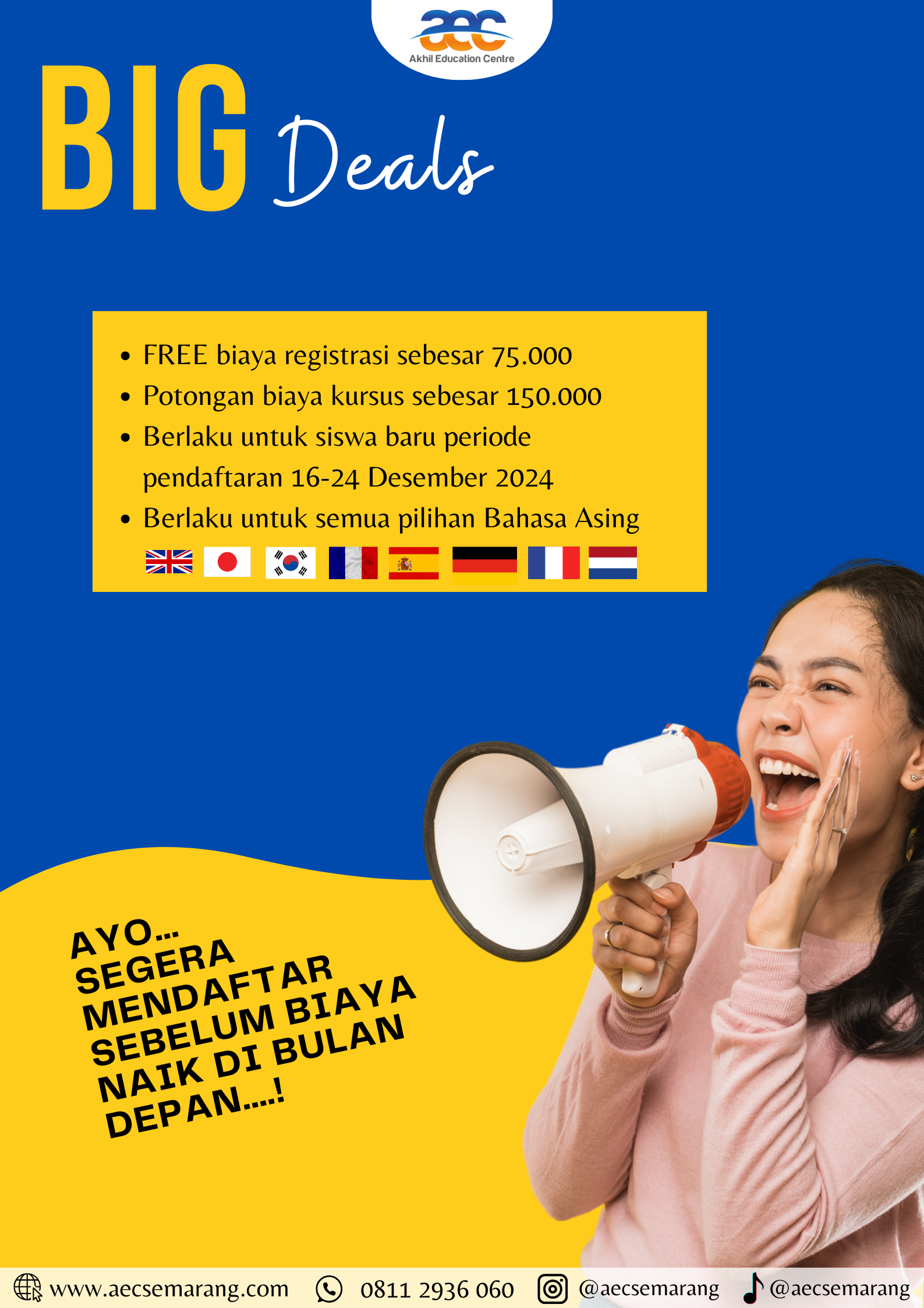 Nah, di akhir tahun ini AEC Semarang sedang mengadakan promo special akhir tahun buat semua temen temen yang ingin mendaftar kursus di periode Desember ini lho. Eitss jangan salah promo yg di berikan cukup banyak lho temen temen. Jadi kalian jangan sampai ketinggalan promo special akhir tahun ini ya.