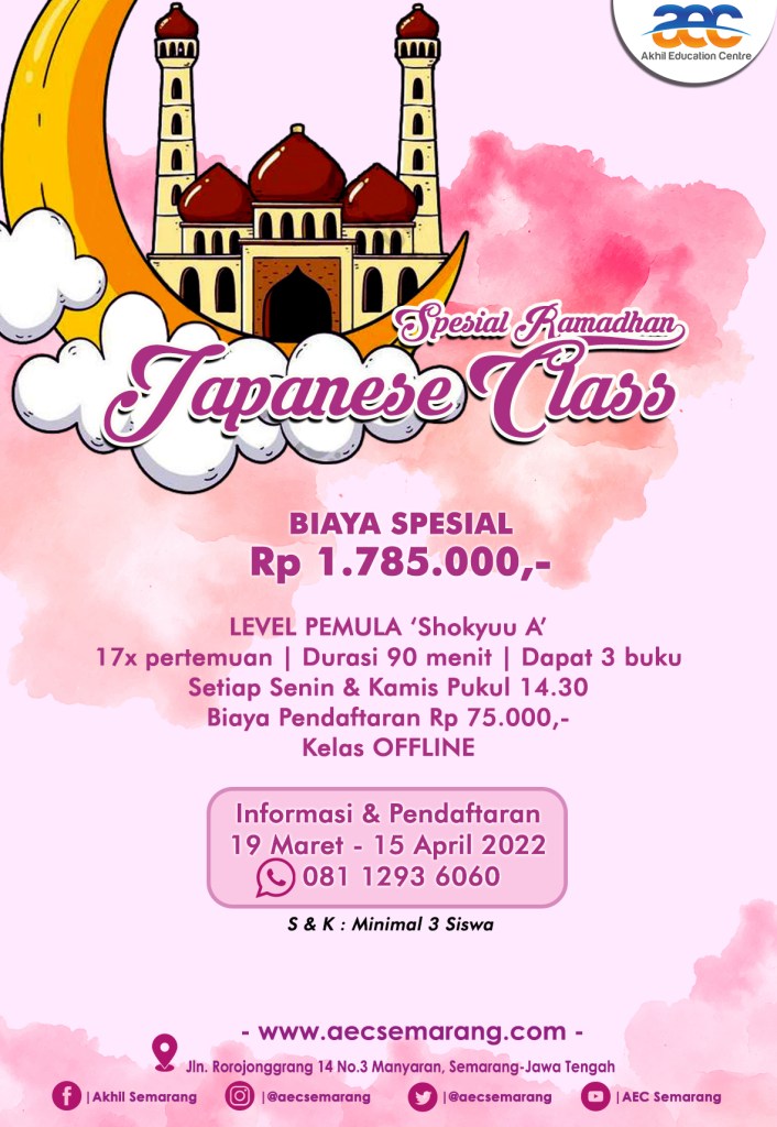 Akhil Education Centre [AEC] Semarang telah membuka kembali program Ramadhan Fiesta di tahun 2022 ini. Program Ramadhan Fiesta kali ini khusus untuk Bahasa Jepang. Nah, kalian yang ingin belajar Bahasa Jepang bisa sekali bergabung di kelas Bahasa Jepang moment Ramadhan Fiesta ini.