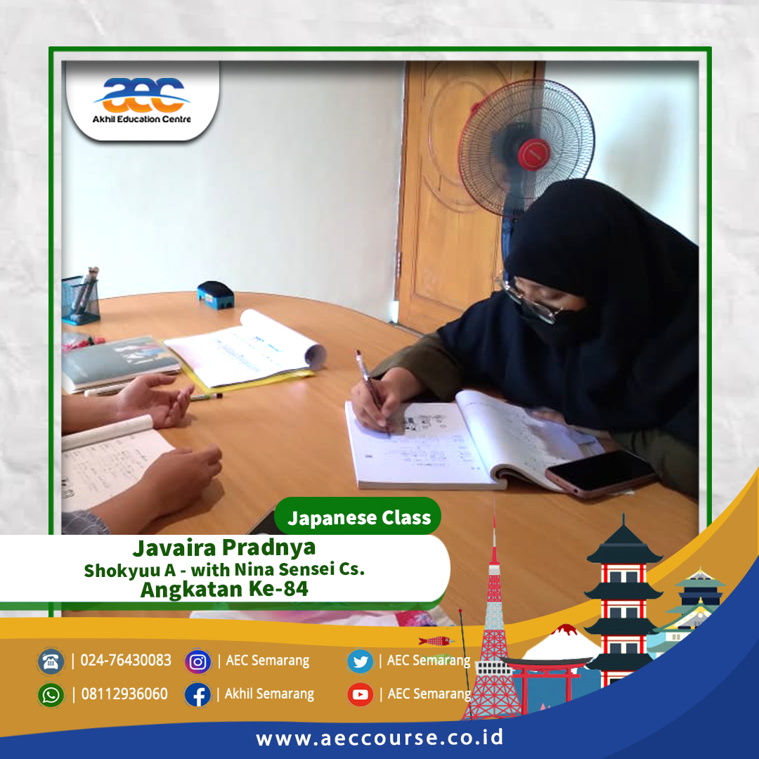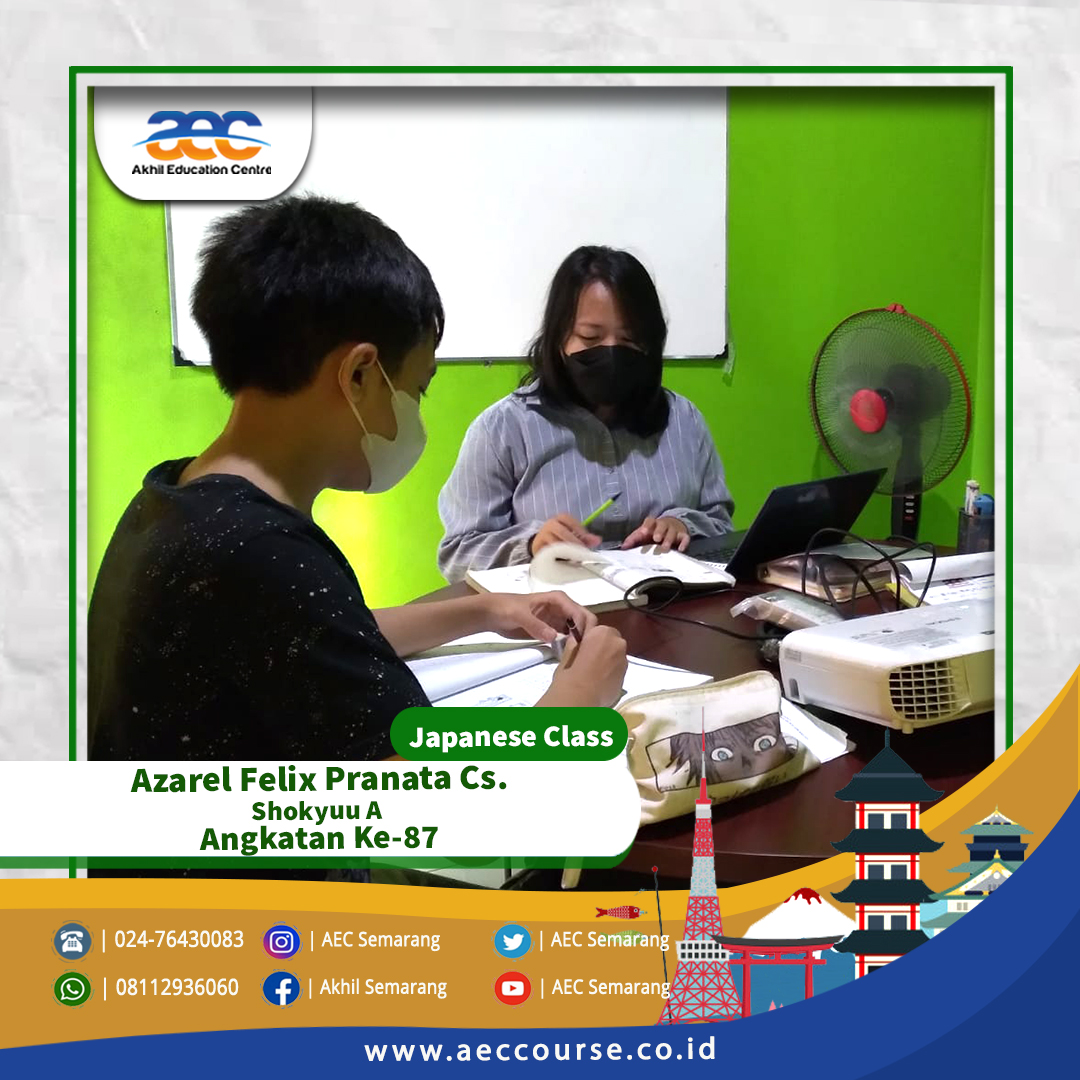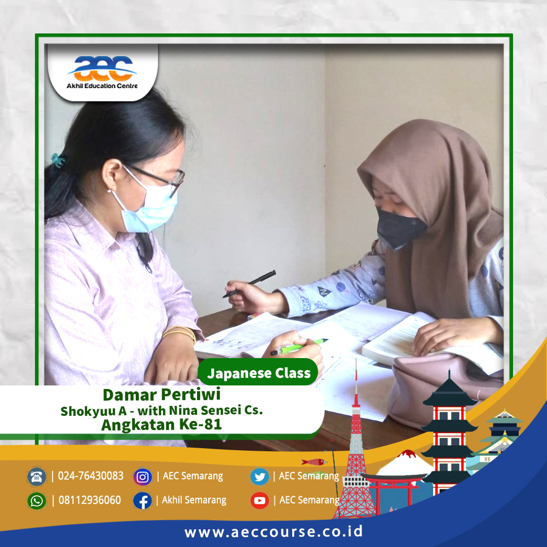 AEC Semarang memiliki banyak pilihan kelas Bahasa Jepang yang bisa diambil. Mulai dari kelas pemula (untuk mereka yang belum ada bekal bahasa Jepang sama sekali), kelas lanjutan hingga kelas JLPT Preparation (untuk mereka yang akan mengambil ujian JLPT). Pembelajaran bisa dilaksanakan secara Online atau Offline.