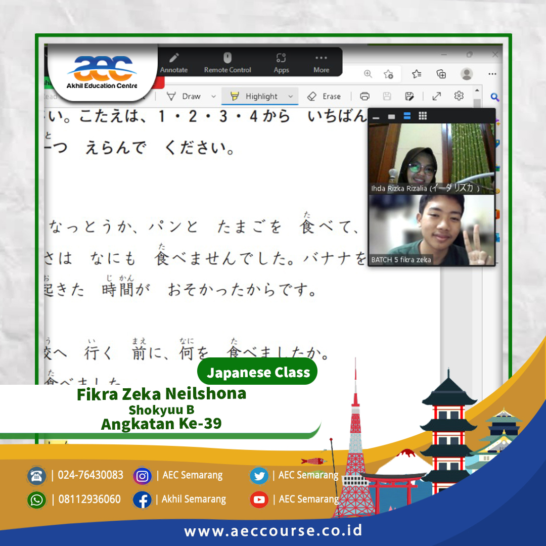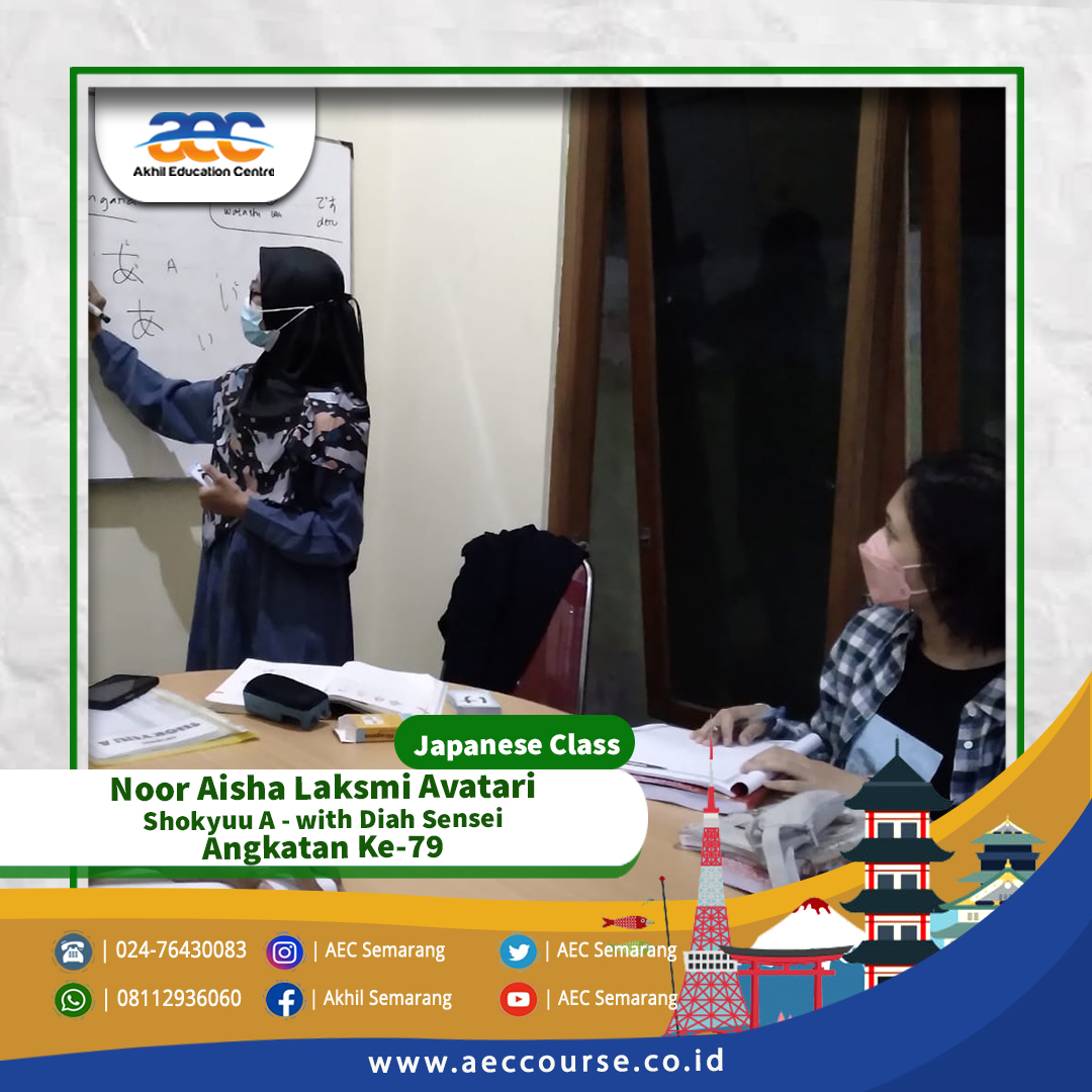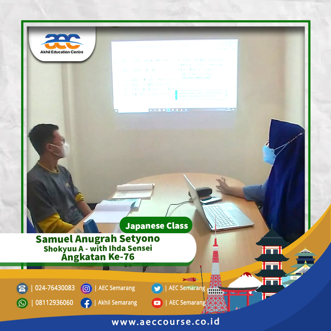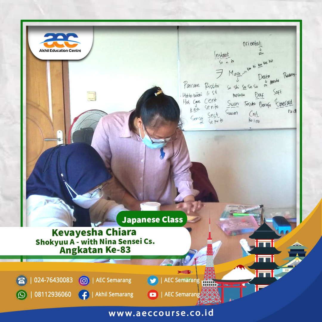 AEC Semarang memiliki banyak pilihan kelas Bahasa Jepang yang bisa diambil. Mulai dari kelas pemula (untuk mereka yang belum ada bekal bahasa Jepang sama sekali), kelas lanjutan hingga kelas JLPT Preparation (untuk mereka yang akan mengambil ujian JLPT). Pembelajaran bisa dilaksanakan secara Online atau Offline.