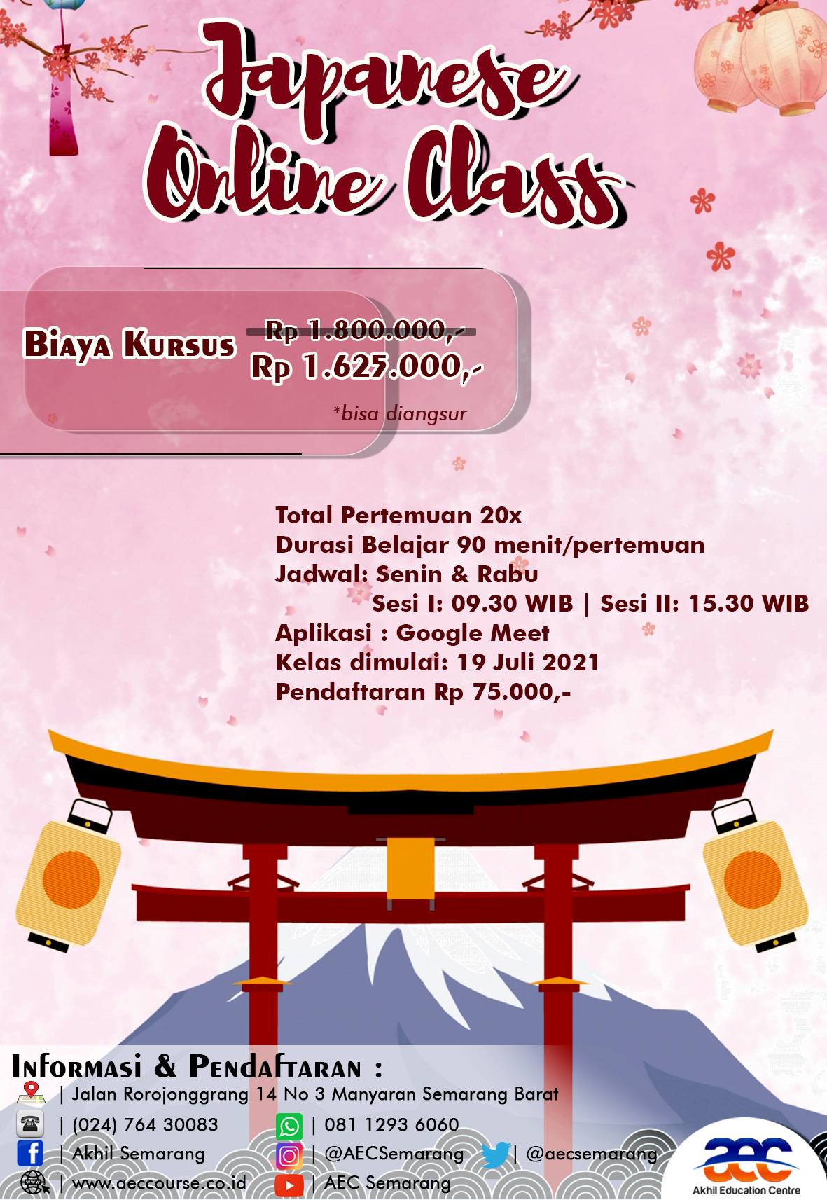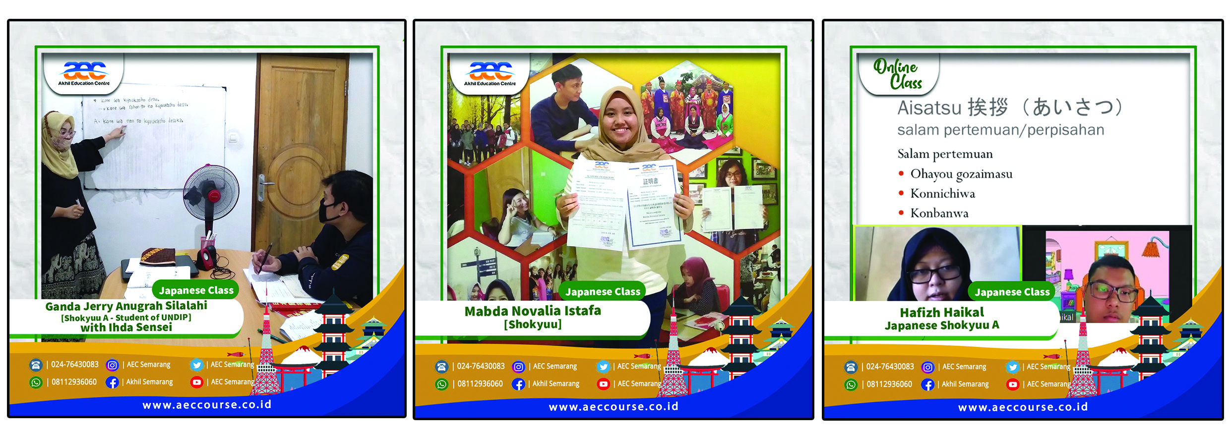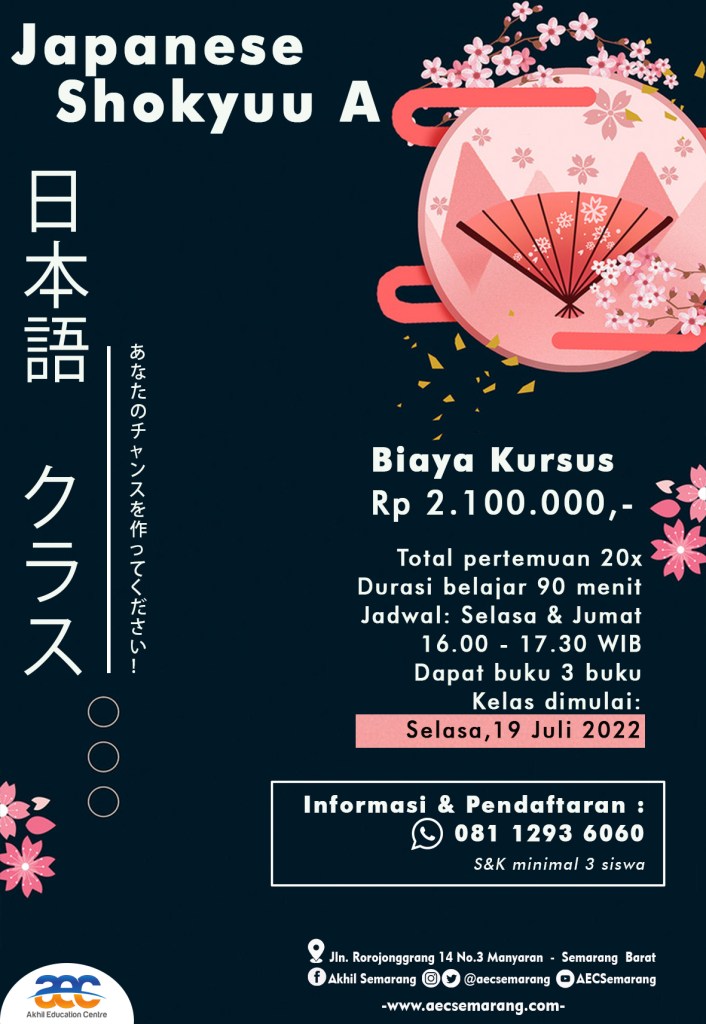 Akhil Education Centre [AEC] Semarang, di bulan Juli 2022 ini membuka Pendaftaran Kelas Kursus Bahasa Jepang untuk pemula. Teman-teman yang ingin belajar Bahasa Jepang bisa sekali join di kelas ini. Pendafatran Kelas Kursus Bahasa Jepang yang dibuka kali ini merupakan kelas pemula atau Level Shokyuu A. Bagi kalian yang belum punya bekal bahasa Jepang tak perlu takut untuk join di kelas kali ini. Perlu kalian ketahui jika Level Shokyuu A ini setara dengan materi N5. Detail Kelas Kursus Bahasa Jepang di bulan Juli 2022 ini sebagai berikut: