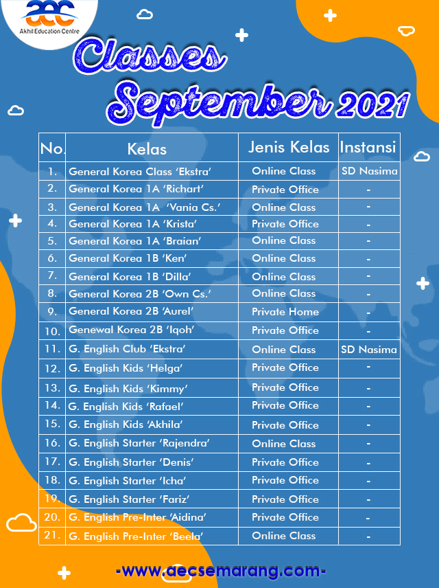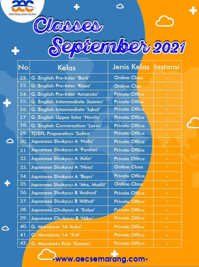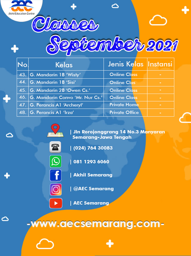Tak terasa kita sudah sampai di bulan September guys. Saatnya kita share kelas-kelas apa saja yang ada di bulan September 2021 ini. Bulan September 2021 ini kelas-kelas di AEC Semarang masih tetap penuh. Banyak siswa yang bergabung di AEC Semarang untuk belajar Bahasa Asing.