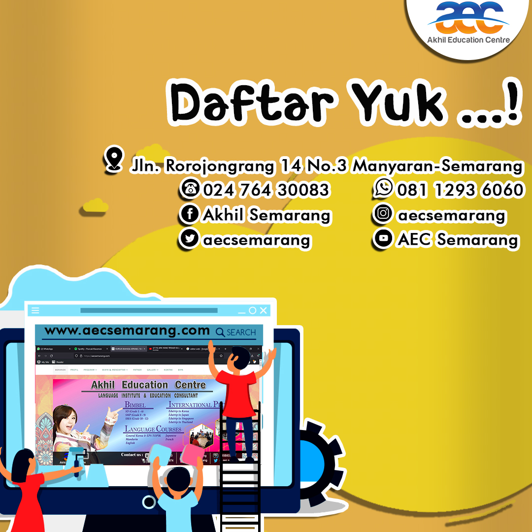 Akhil Education Centre [AEC] Semarang merupakan Lembaga Kursus dan Pelatihan Bahasa Asing di Semarang yang sudah mengantongi Izin Operasional dari Dinas Pendidikan Kota Semarang serta telah memiliki Nomor Pokok Sekolah Nasional [NPSN]. AEC Semarang memberikan berbagai pilihan kelas bahasa Asing antara lain Korea, Jepang, Mandarin, Inggris, Prancis, Jerman, Spanyol dan Arab. Selain banyaknya pilihan bahasa Asing yang bisa dipilih, kalian juga bisa menentukan tipe kelas apa yang diinginkan. Private, Kelompok, Online, Offline disesuaikan dengan kebutuhan dan keinginan kalian semua. Cara pendaftarannya pun cukup mudah lho. Berikut langkah-langkah mendaftar kursus di AEC Semarang.