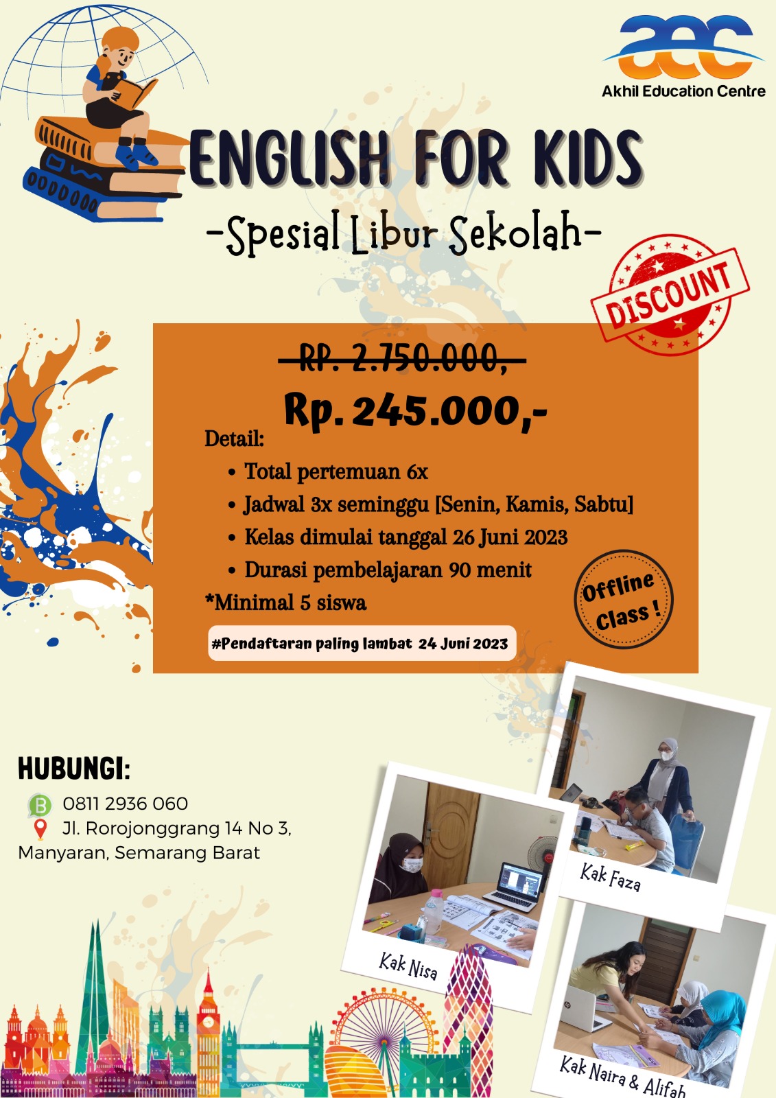 Akhil Education Centre [AEC] Semarang hadir kembali dengan PROGRAM SPESIAL LIBUR SEKOLAH. Bunda-bunda yang ingin memberikan kegiatan positif untuk mengisi waktu selama libur sekolah bisa sekali join bersama AEC Semarang.