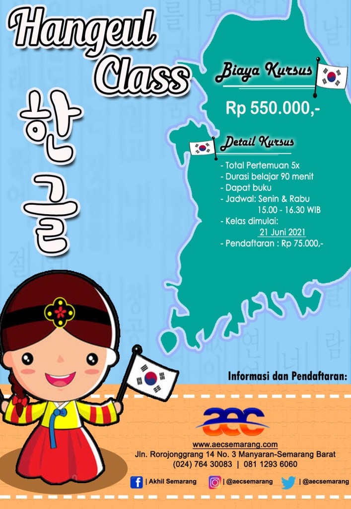 Akhil Education Centre [AEC] Semarang kembali membuka Kelas Kursus Bahasa Korea di bulan Juni 2021 ini guys. Kalian yang sedang mencari tempat kursus bahasa korea dan ingin belajar Bahasa Korea langsung saja merapat ke AEC Semarang. Kelas Kursus Bahasa Korea di bulan Juni 2021 ini merupakan kelas Bahasa Korea Pemula atau Hangeul Class.
