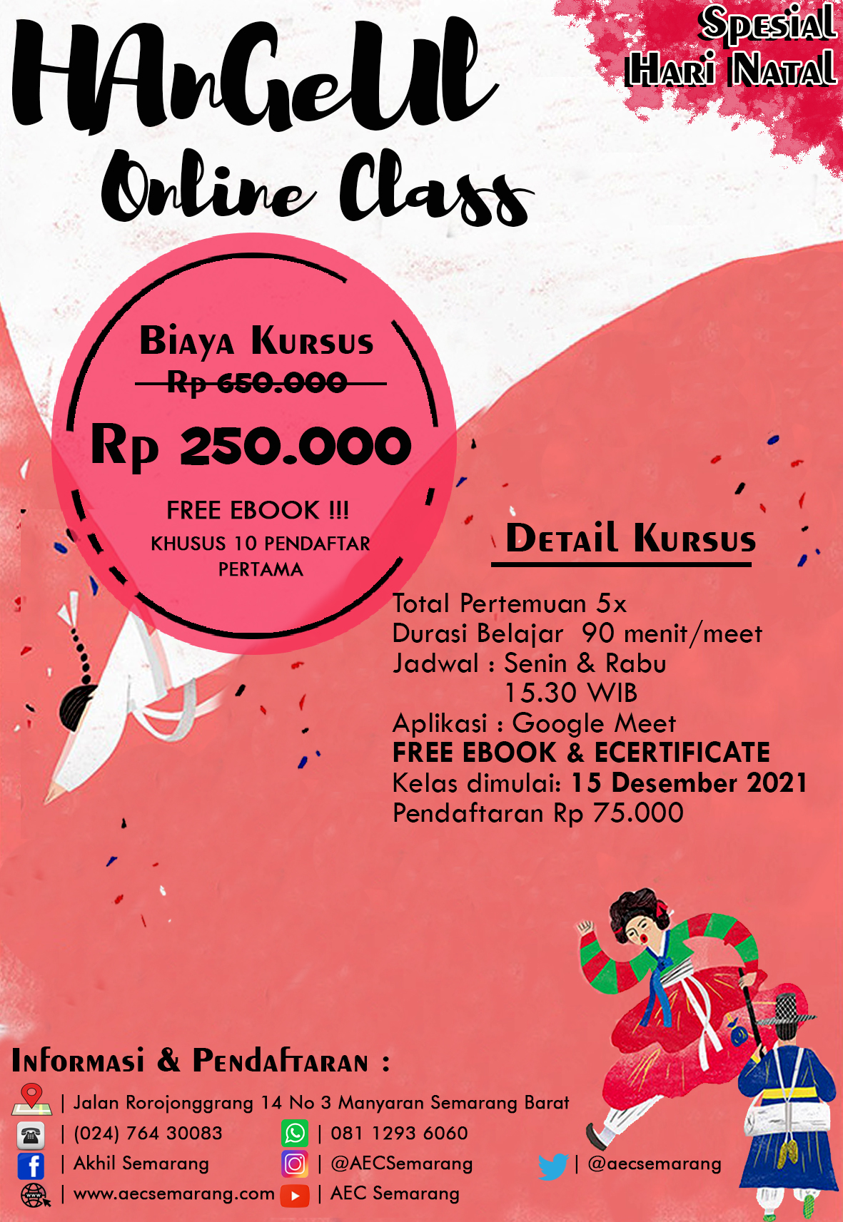 Kalian yang harus #DirumahAja selama #Natal&TahunBaru2022 ini, tak perlu sedih dan bingung. Kalian masih bisa ikut KURSUS BAHASA KOREA ONLINE dari AEC Semarang. Biaya kursus Bahasa Korea Online di bulan Desember ini sangat amat murah guys. Kalian juga akan mendapatkan Esertifikat setelah kelas berakhir.