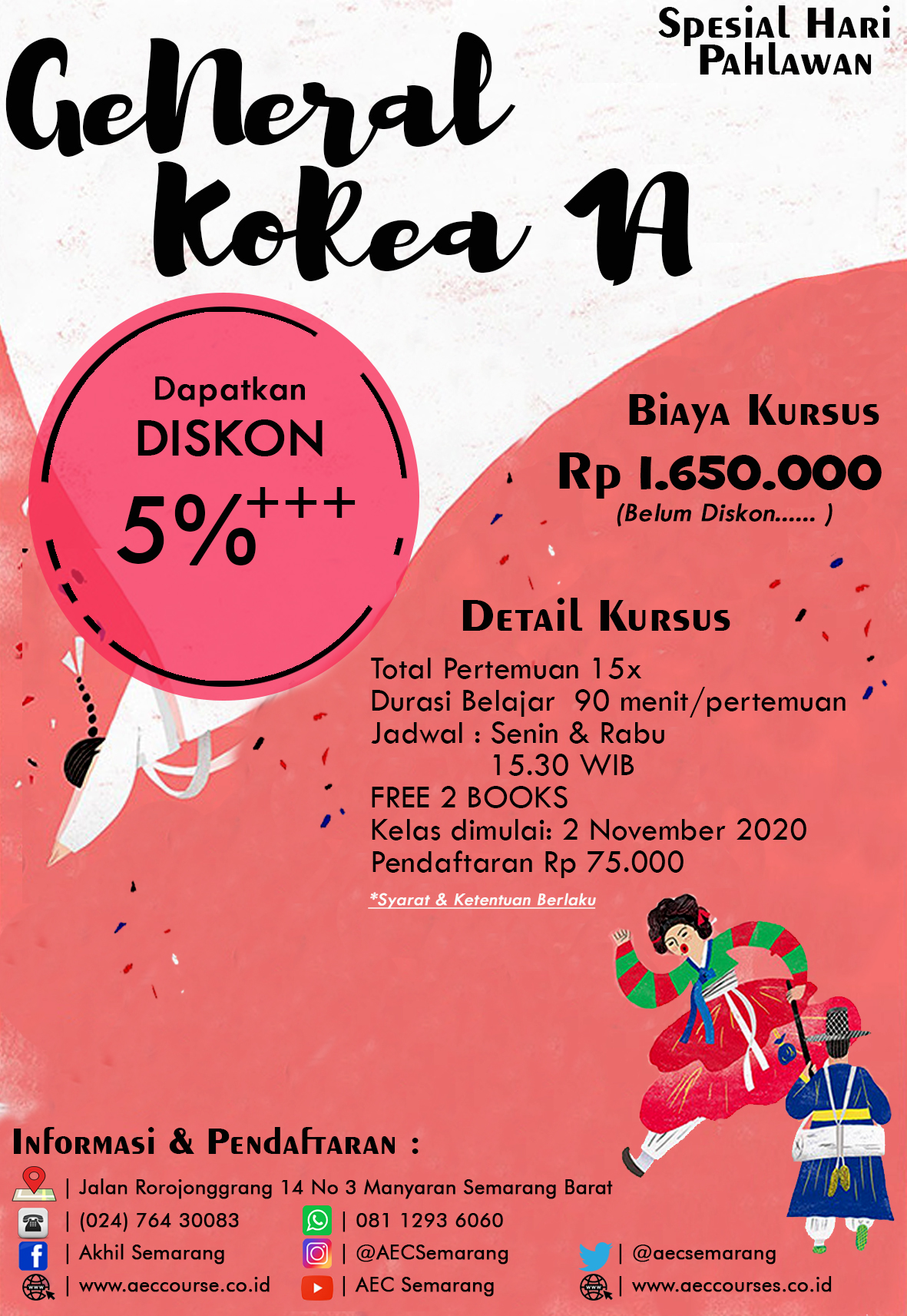 Kabar Gembira untuk kalian semua. Akhil Education Centre [AEC] Semarang kembali menghadirkan Kelas Bahasa Korea Online Spesial Moment Ramadhan Fiesta. KELAS KURSUS ONLINE yang dibuka kali ini adalah Kelas Kursus Bahasa Korea Pemula. Teman-teman yang ingin belajar Bahasa Korea tapi belum bisa sama sekali tak perlu khawatir. Kalian bisa sekali join di kelas ini.
