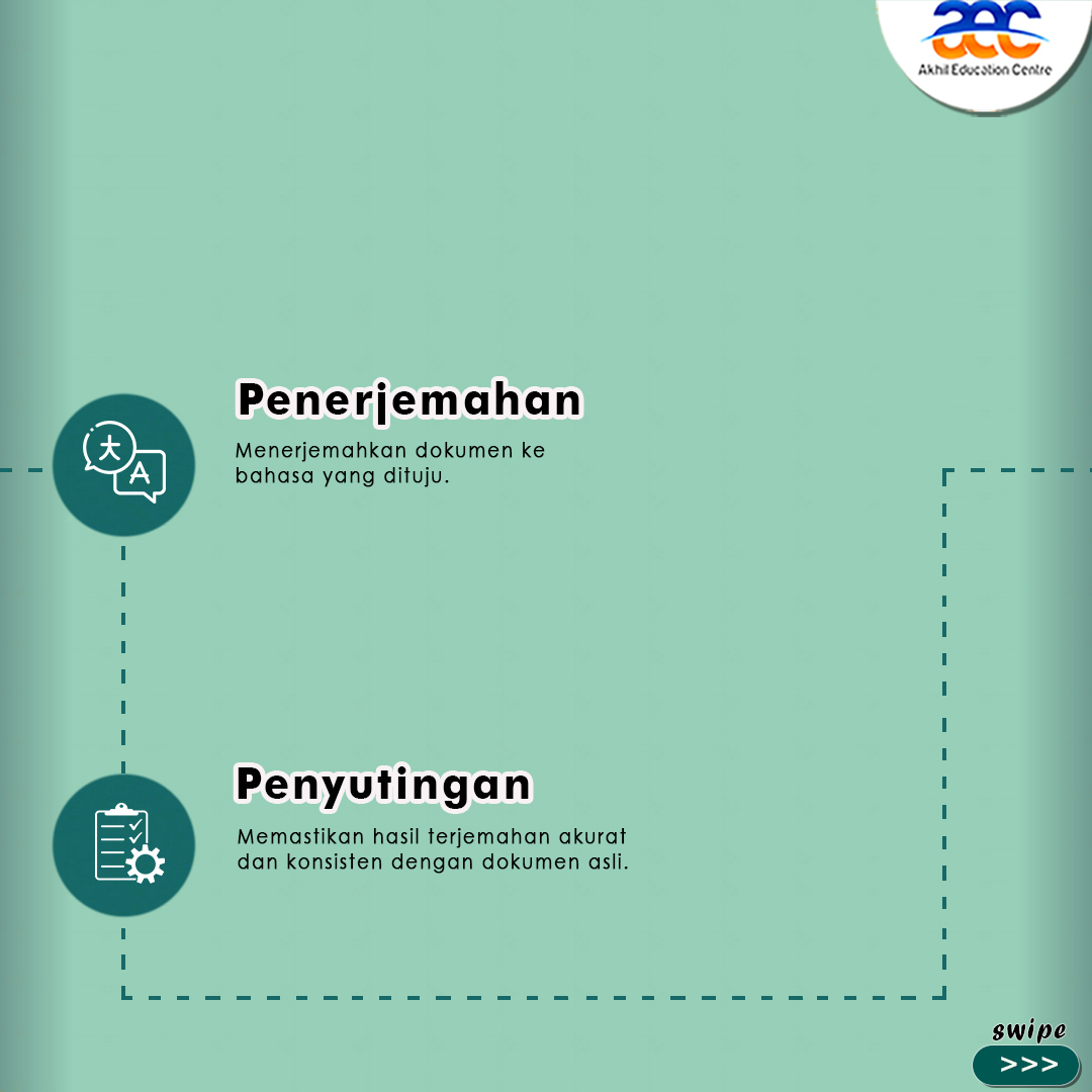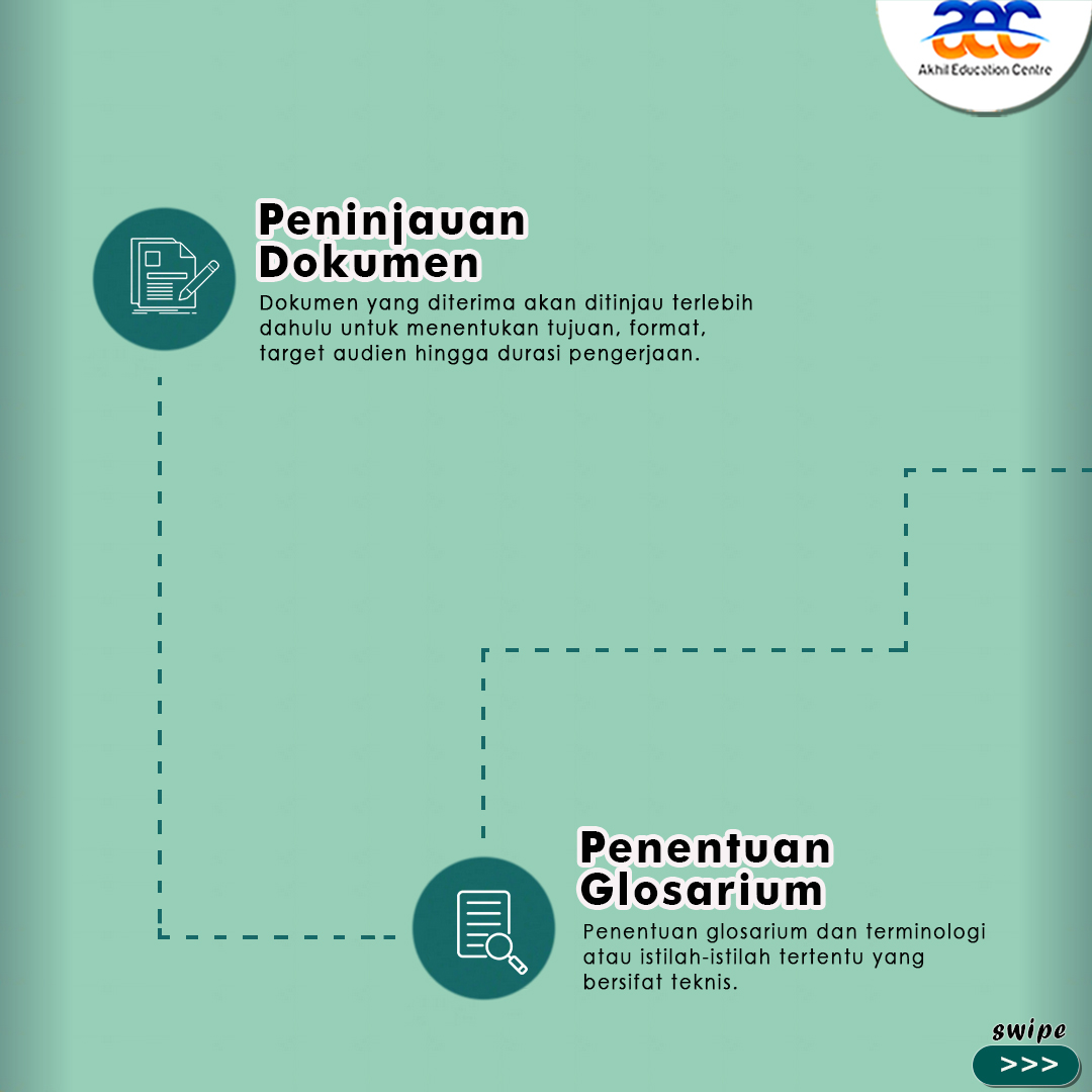 Semua dokumen yang masuk ke Kantor Akhil Education Centre [AEC] Semarang akan melalui tahapan peninjauan dokumen terlebih dahulu di awal. Tahapan ini merupakan tahapan dimana dokumen yang akan diterjemahkan ditinjau terlebih dahulu oleh penerjamah AEC. Tahap ini dilakukan untuk menentekukan tujuan, format hasil, target audien, biaya, durasi pengerjaan dan estiminasi halaman hasil jadi. Setelah itu baru lanjut ke tahapan berikutnya