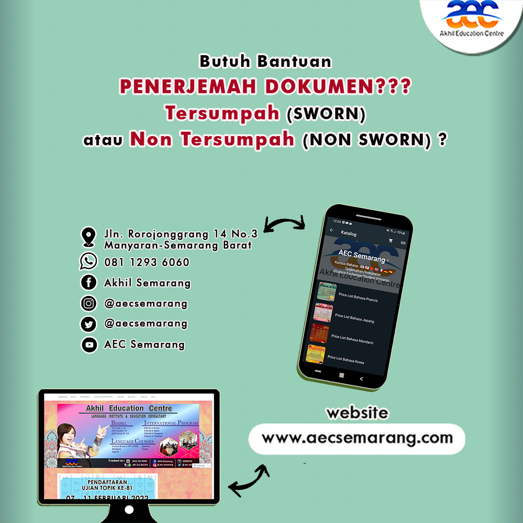 Akhil Education Centre [AEC] Semarang menerima Jasa Penerjemah atau Translate Dokumen secara tersumpah. Bagi kalian yang butuh menerjemahkan dokumen tersumpah atau SWORN Translator bisa langsung hubungi AEC ya.  AEC Semarang menerima Terjemahan Dokumen tersumpah.