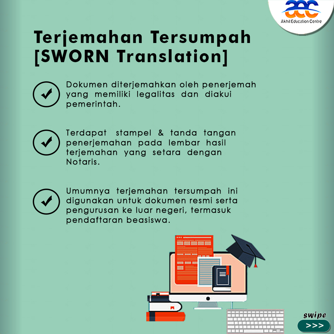 Terjemahan Tersumpah (SWORN Translation) merupakan jasa penerjemah dokumen yang dokumennya diterjemahkan oleh penerjemah yang memiliki legalitas dan diakui oleh pemerintah. Salin itu, kalian juga akan menemukan stempel & tandatangan penerjemah dihasil akhir terjemahannya yang setara dengan Notaris. Terjemahan Tersumpah ini, umumnya digunakan untuk dokumen resmi atau untuk pengurusan luar negeri, termasuk pendaftaran beasiswa.