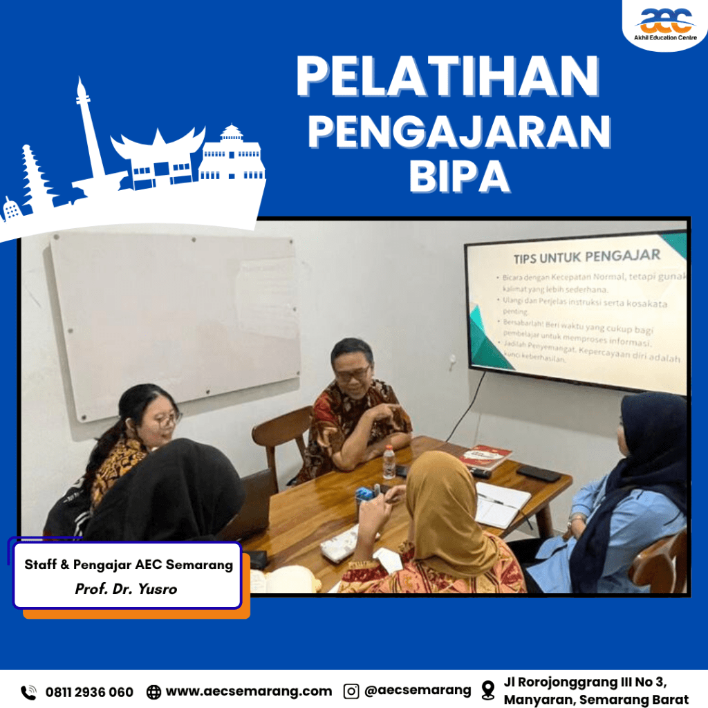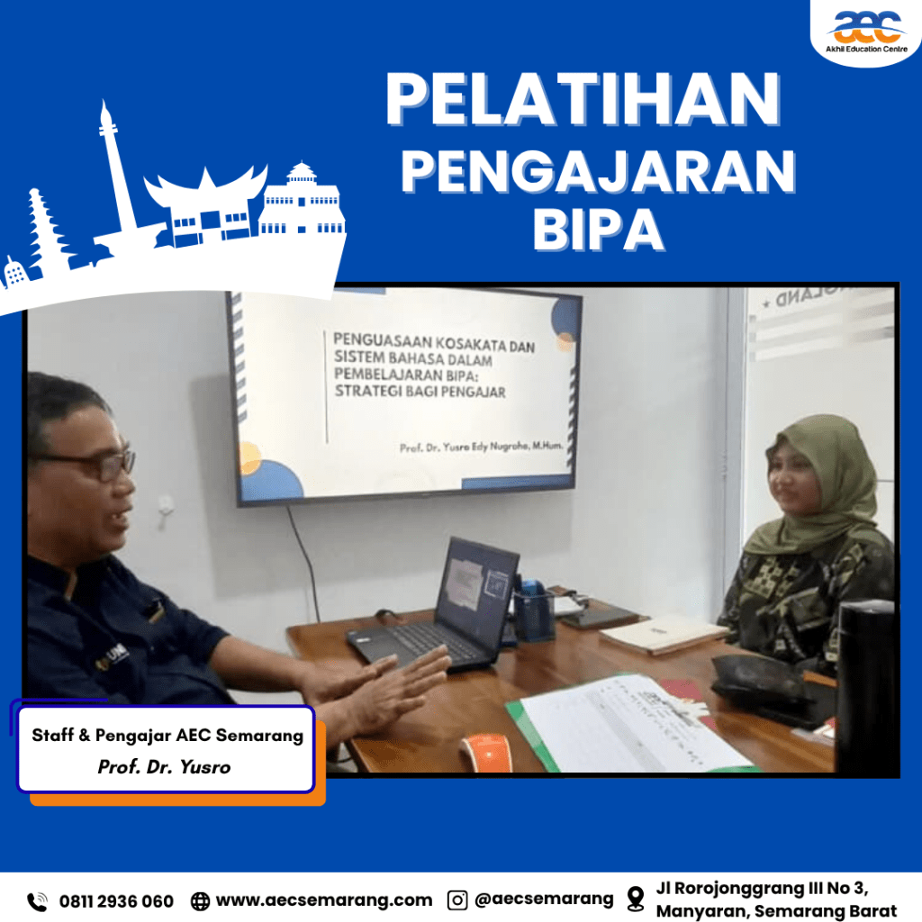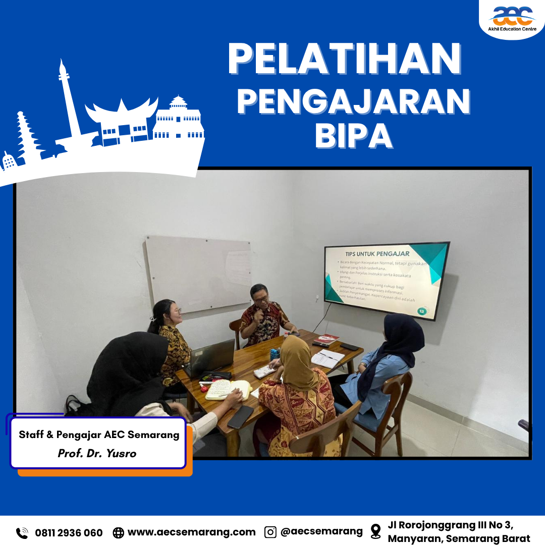 Kalimat diatas mencerminkan yang saat ini AEC Semarang terapkan di lingkungan kantor. AEC Semarang mengadakan pelatihan bagi staff dan pengajar AEC Semarang untuk menjadi pengajar BIPA yang handal dan professional. Pelatihan pengajaran BIPA ini dilatih Prof. Dr. Yusro yang tentunya sudah ahli dan profesional dalam bidang BIPA semenjak tahun 2015.