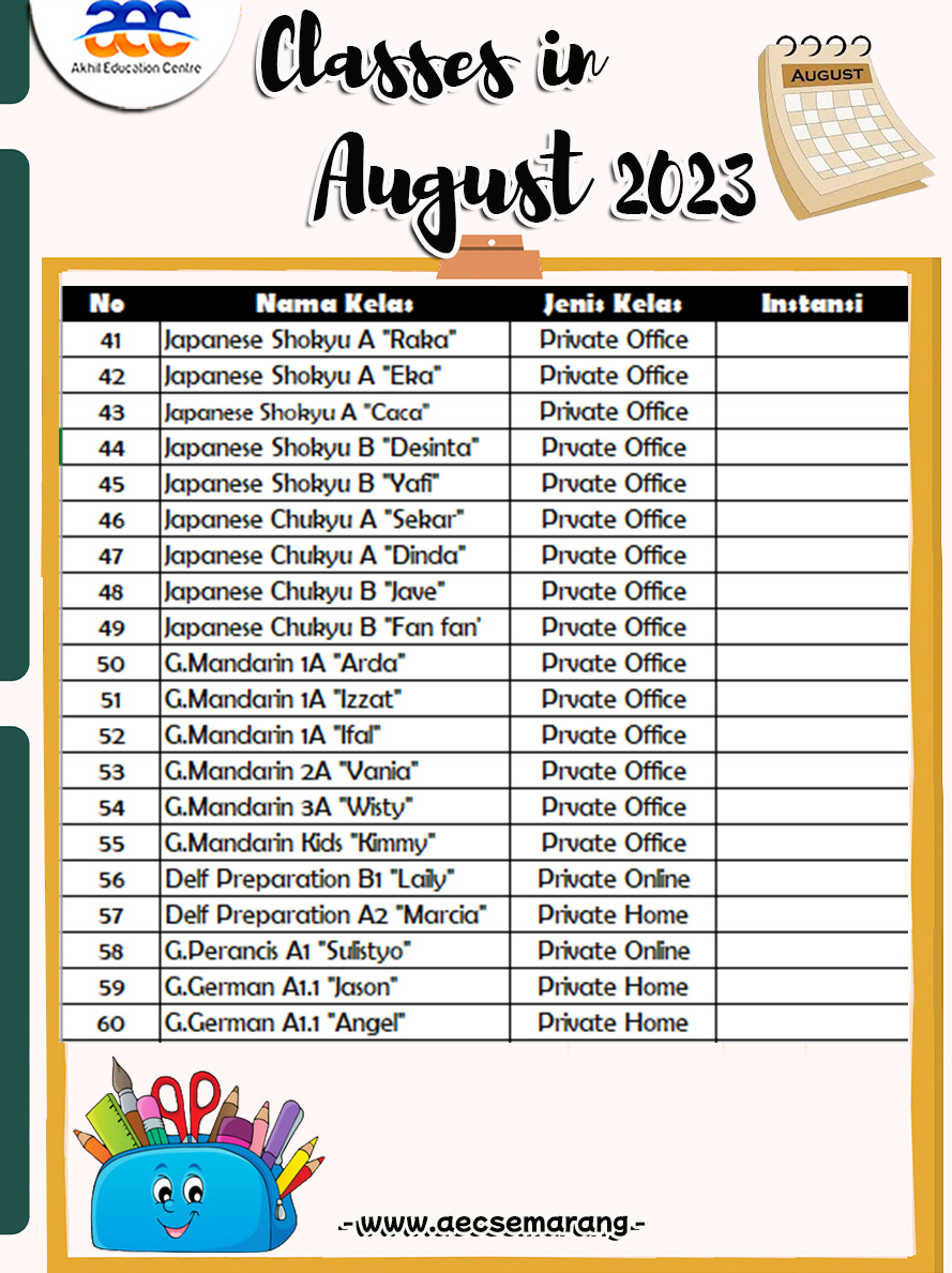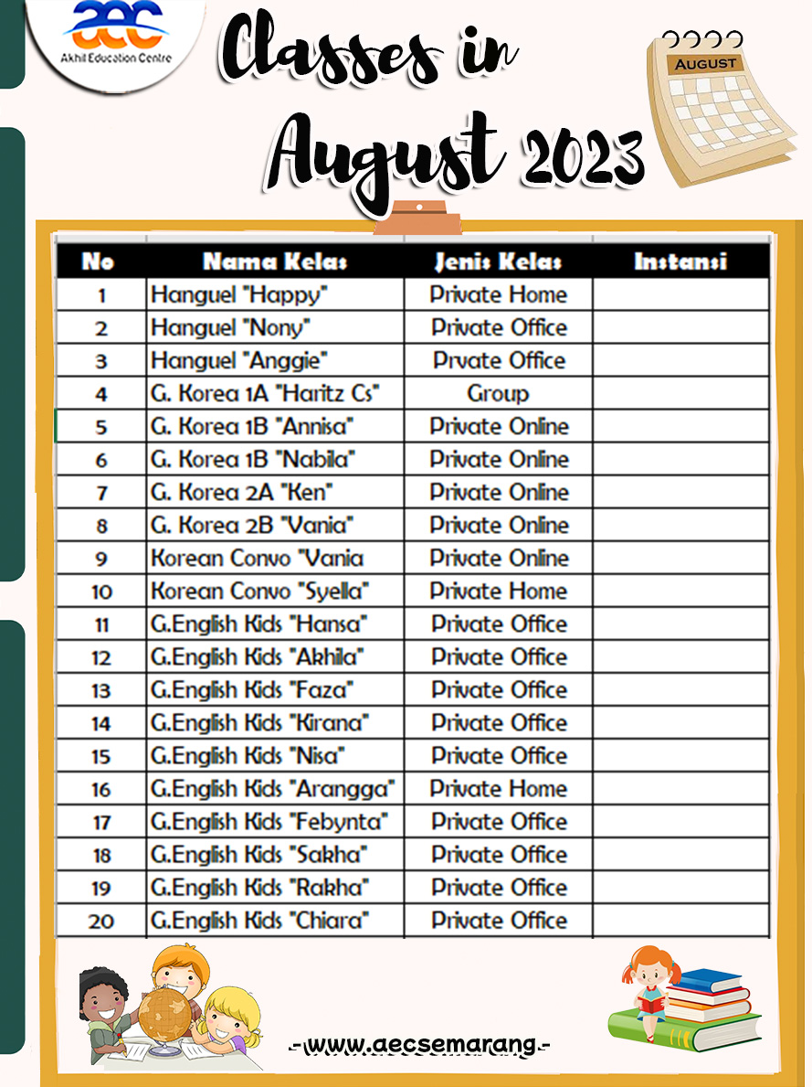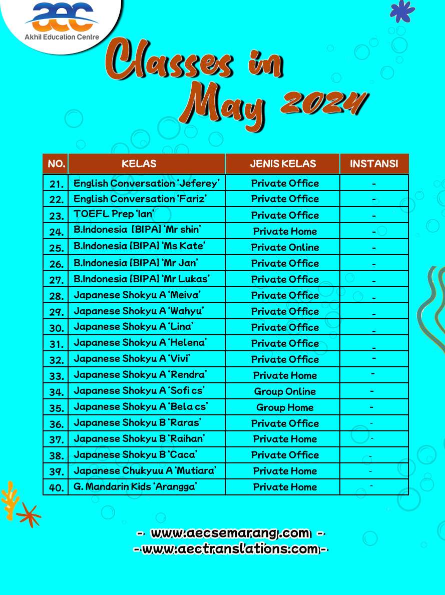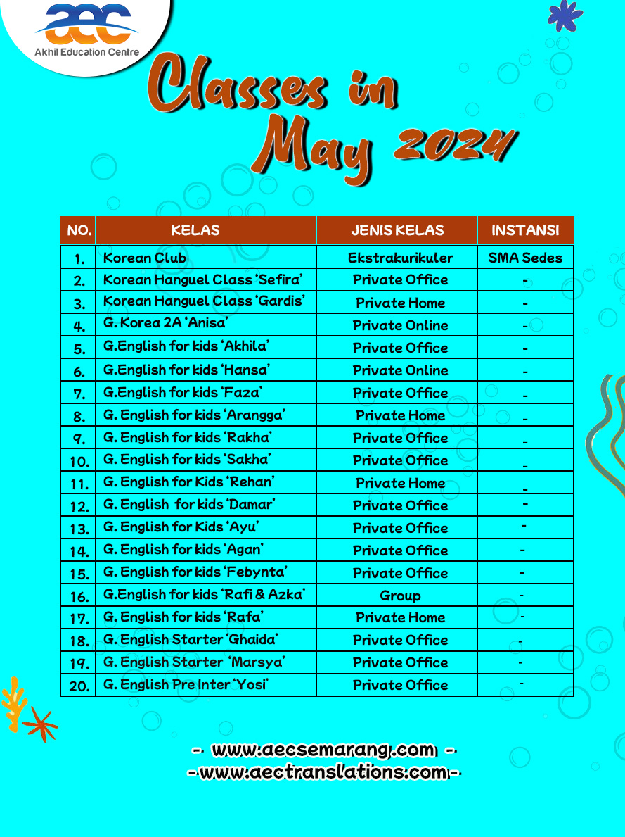 Karena seperti yang kita ketahui bahwa anak anak dikenal dengan suasana hati yang dapat berubah setiap saat. Tapi tidak usah khawatir ya kalau di AEC Semarang bisa mengambil kelas Bahasa Inggris dari usia anak anak s.d usia dewasa. Siswa dapat mengambil level sesuai dengan kemampuan siswanya, jadi tidak usah khawatir ya. Jika masih bingung level yang akan diambil bisa mengikuti placement test terlebih dahulu ya.