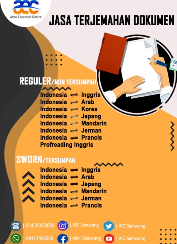 Bagi instansi atau perseorangan yang ingin menerjemahkan dokument bisa langsung hubungi Akhil Education Centre [AEC] Semarang di