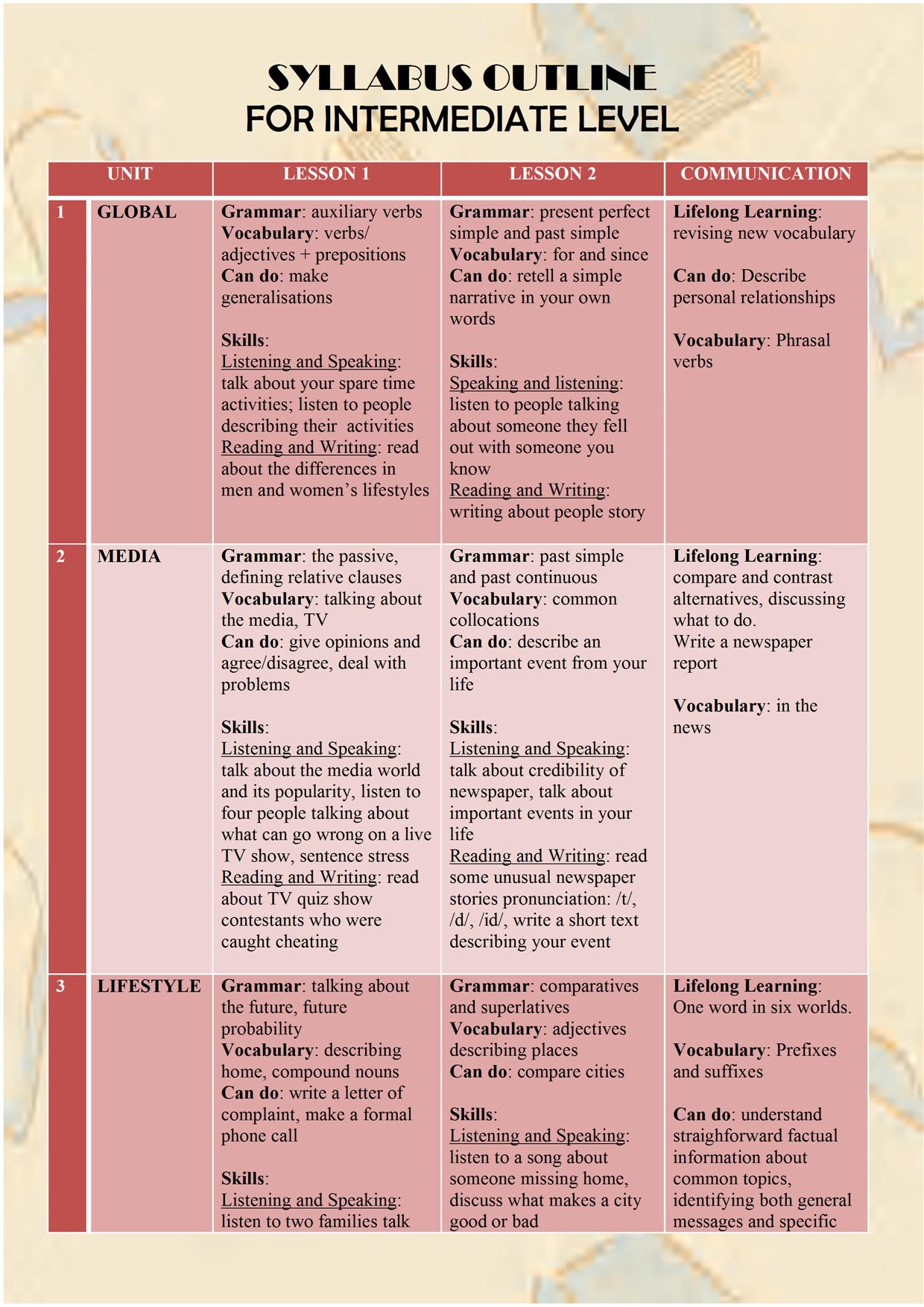 Di level Intermediate, para pelajar akan mempelajari cara menggunakan bahasa yang lebih abstrak ke dalam bacaan, tulisan dan pembicaraan sembari mengembangkan kemampuan tata bahasa. Para pelajar diharapkan nantinya akan mampu terlibat dalam pembicaraan yang lebih kompleks dan lebih mengerti dasar-dasar penggunaan kata atau konteks khusus. Kalian dapat memahami bahasa Inggris lisan, dan untuk berkomunikasi secara efektif dengan penutur asli dalam situasi kehidupan nyata, meski mungkin dalam beberapa situasi masih akan menemui kesulitan.