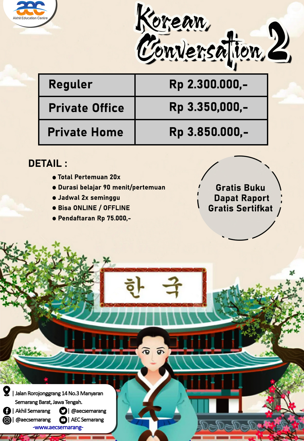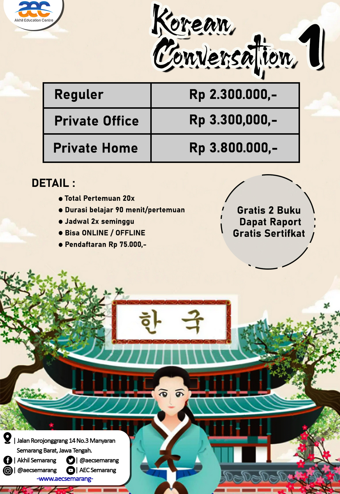 KOREAN CONVERSATION 안녕 하세요 🙂한국말하고 싶습니까?그럼 우리 새 프로그램에 다녀 오세요 ^^ “말하기 수업: Let’s Speak Korean” Hello 🙂Do you wanna speak Korean?Let’s join our new program ^^ “Conversation Class: Let’s Speak Korean” Informasi & Pendaftaran Chat on WhatsApp Bagikan ini: Klik untuk berbagi di X(Membuka di jendela yang baru) X Lagi Klik untuk membagikan di Facebook(Membuka di jendela yang baru) Facebook Klik untuk berbagi di WhatsApp(Membuka di jendela yang baru) WhatsApp Klik untuk mengirimkan email tautan ke teman(Membuka di jendela yang baru) Surat elektronik Suka Memuat...