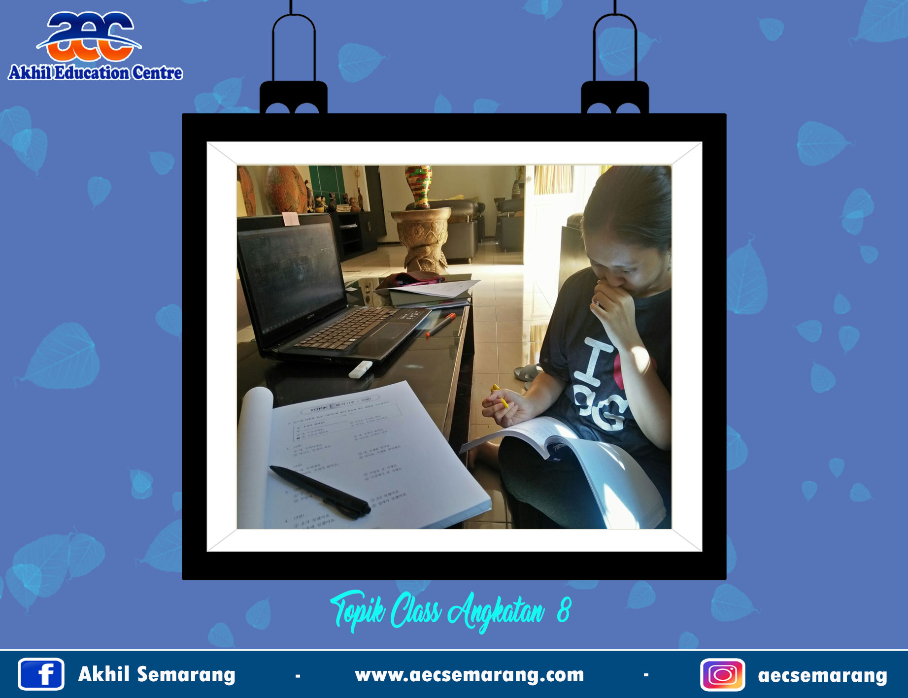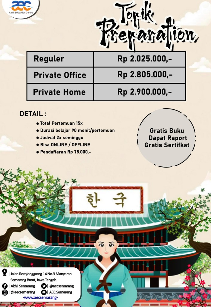 Therefore, AEC Semarang opened a preparatory study of TOPIK program, where students already passed Korean minimal 1B level. The material will be given to this course is a tryout and discussion of TOPIK [most recently published by NIIED]