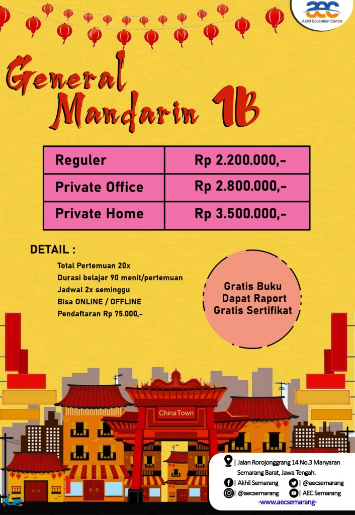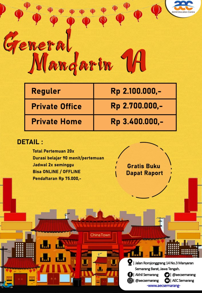 Kelas General Mandarin ini merupakan kelas Bahasa Mandarin level dasar. Materi yang diberikan berupa pengenalan huruf, cara pelafalan, tatabahasa sederhana dan percakapan sederhana. General Mandarin Level 1 ini dibagi menjadi 2 level yaitu General Mandarin 1A dan 1B.