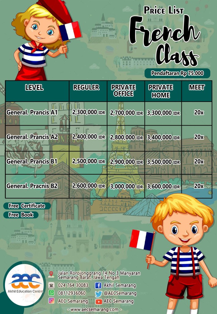 Akhil Education Centre [AEC] Semarang membuka program Bahasa Prancis lho Program kursus Bahasa Prancis ini khusus bagi kalian semua yang tertarik belajar Bahasa Prancis dan mendalaminya. Kursus Bahasa Prancis di Akhil Education Centre [AEC] Semarang terbagi menjadi beberapa level guys. Mulai dari level pemula hingga level lanjutan.